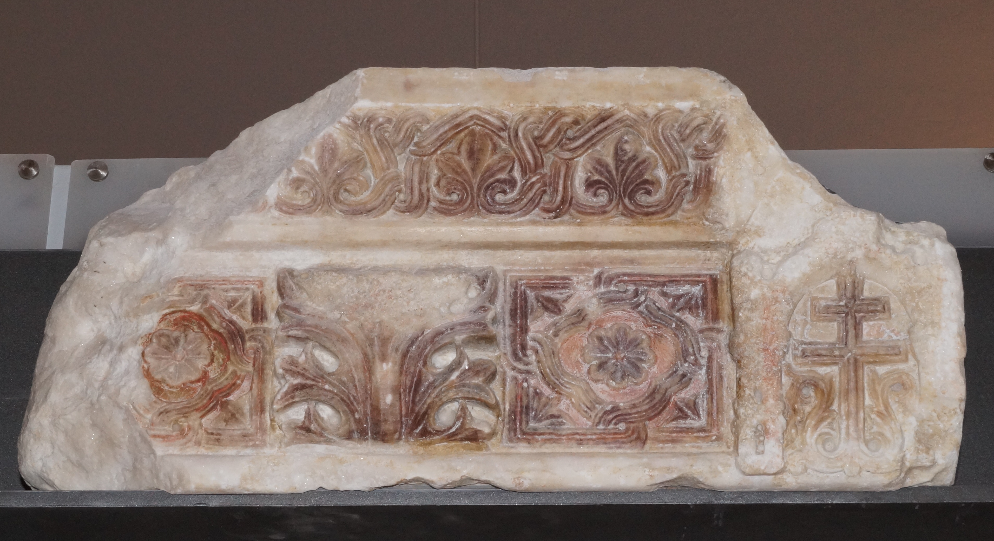 Τμήμα επιστυλίου τέμπλου, φέρει άνω ζώνη με ανθέμια και κάτω ρόδακες πλαισιωμένους από συμπλεκόμενες κλιματίδες, που διακόπτονται από τα έξεργα μοτίβα ενός διπλού σταυρού και ενός ανθεμωτού κοσμήματος.