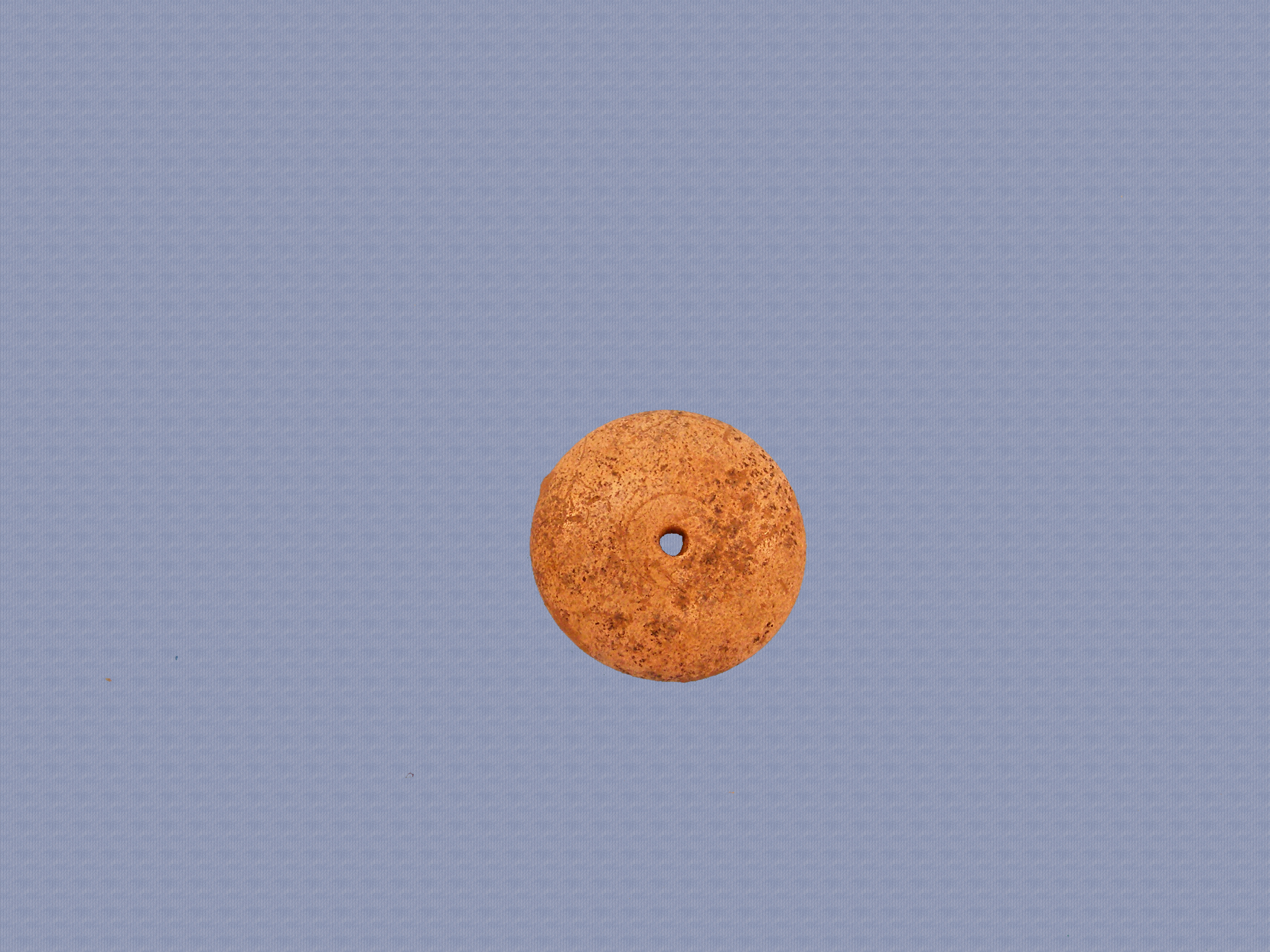 Οστέινο επιπεδόκυρτο κομβίο με διαμπερή οπή στο μέσο. Στην κάτω επιφάνεια φέρει μία κεντρική κυκλική και μία περιφερειακή ταινιωτή εμβάθυνση. Την κυρτή επιφάνεια κοσμεί εγχάρακτος δακτύλιος γύρω από την οπή.