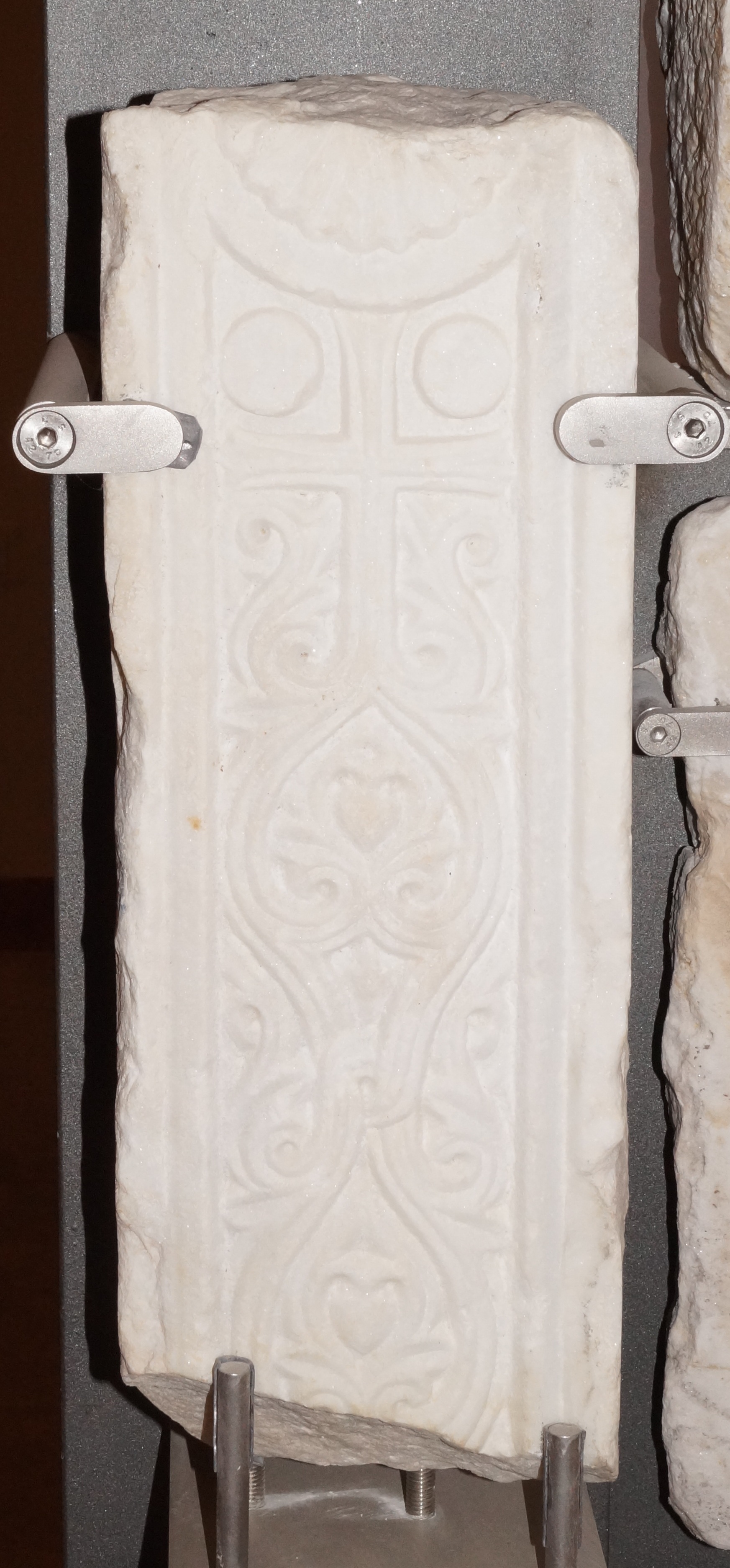 Πεσσίσκος τέμπλου αποθραυσμένος άνω και κάτω. Στην όψη φέρει ανάγλυφο διάκοσμο καλής εκτέλεσης. Στο άνω μέρος σταυρός, από τη βάση του οποίου εκφύονται τριταινιωτοί ελικοειδής βλαστοί που συμπλέκονται σε κόμβο και περικλείουν φυτικό κόσμημα. Στο άνω τμήμα του σταυρού, εκατέρωθεν της κάθετης κεραίας , δισκοειδής κόσμημα. Τον διάκοσμο περικλείει ορθογώνιο πλαίσιο λοξότμητης ταινίας, που καμπυλώνει στο άνω μέρος και περικλείει πολύφυλλο ρόδακα ή ριπιδοειδές κόσμημα. Διατηρείται κονίαμα από την πάκτωση . Οι υπόλοιπες επιφάνειες παραμένουν ακόσμητες και λείες. Στη μια πλάγια επιφάνεια παρατηρούμε ότι έχει αποθραυσθεί κάθετα πιθανώς συμφυής προεξέχουσα πλάκα θωρακίου.