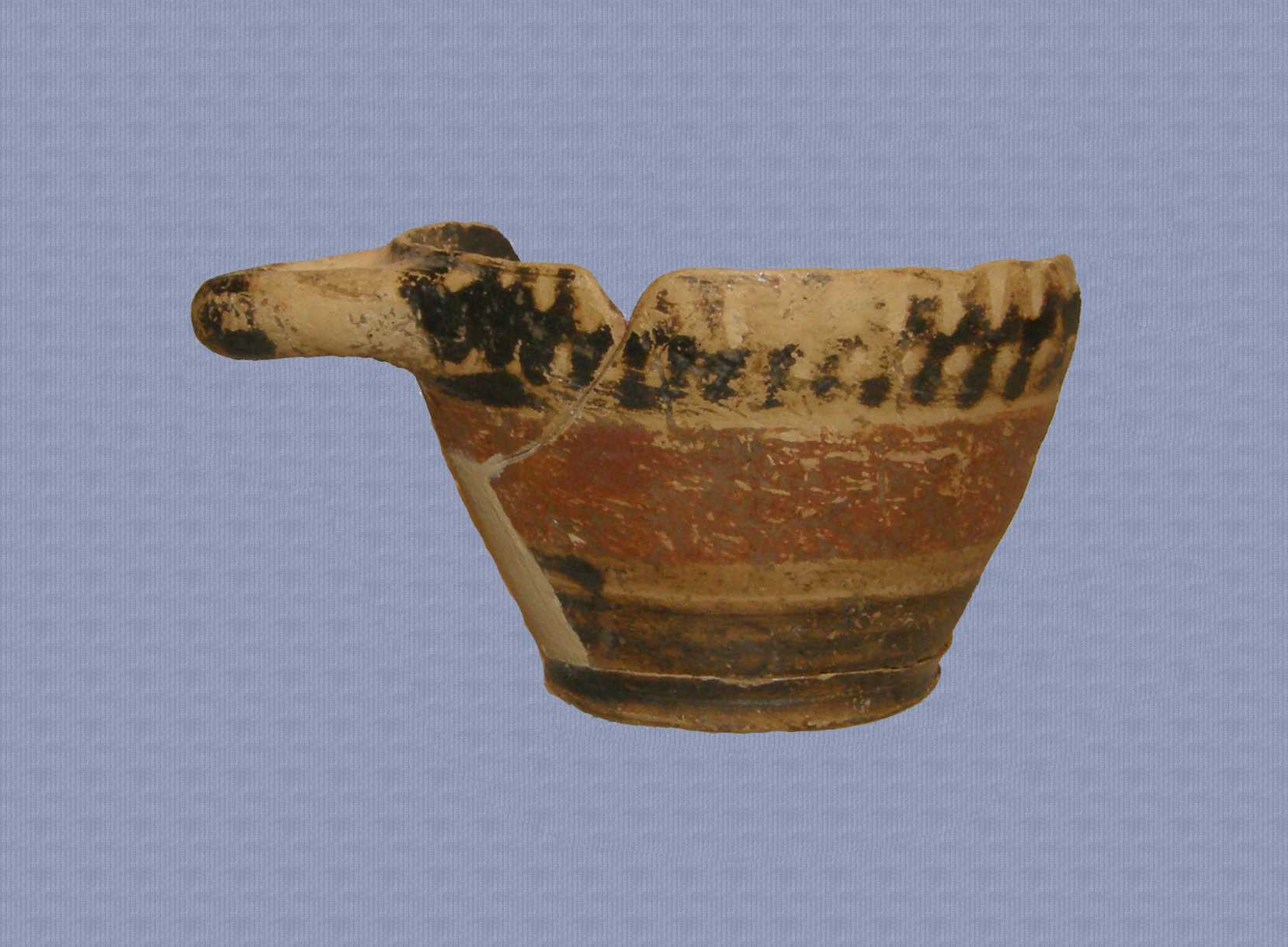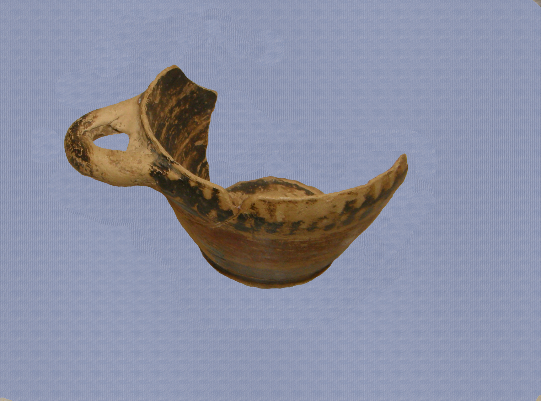 Μικρογραφική κοτύλη, ελλιπής κατά το ήμισυ του σώματος και τη μία λαβή. Συγκολλημένη από τρία όστρακα και συμπληρωμένη σε τμήμα του σώματος. Είναι αρκετά καλοφτιαγμένη, με πολύ χαμηλή δακτυλιόσχημη και ελαφρά κωνική βάση, σώμα με κάθετα, σχεδόν, τοιχώματα, που κλίνουν ελαφρώς προς τα μέσα στο χείλος. Δακτυλιόσχημη, οριζόντια μελνόχρωμη λαβή, στο ύψος, περίπου, του χείλους. Διατηρεί, εσωτερικά, μελανό επίχρισμα και εξωτερικά δύο οριζόντιες, περιφερείς ταινίες καστανού και καστανόκκινου χρώματος (από πάνω προς τα κάτω, αντίστοιχα), και κάθετες, μελανόχρωμες γραμμές στη ζώνη των λαβών.