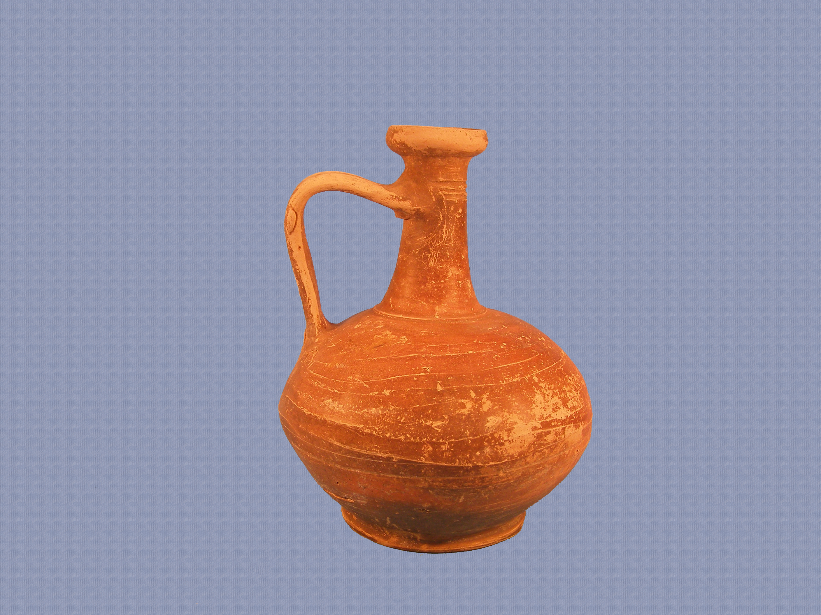 Ερυθροβαφής λάγυνος, ακέραιη, ραγισμένη κατά τόπους στο σώμα. Έχει σώμα πεπιεσμένο σφαιρικό, λαιμό σχετικά ψηλό, που στενεύει σταδιακά προς τα πάνω, χείλος υπερυψωμένο, με κλίση προς τα μέσα, λαβή τριπλή ταινιωτή, κάθετη στον ώμο που καμπυλώνεται για να ενωθεί κάθετα με το λαιμό, και βάση δακτυλιόσχημη. Στην ένωση του λαιμού με το σώμα υπάρχει ανάγλυφη ράβδωση και λίγο πιο πάνω εγχάρακτη ταινία. Έχει επίσης δύο ελαφρώς ανάγλυφες, ακανόνιστες ραβδώσεις στο σώμα. Το αγγείο δεν είναι προσεκτικά κατασκευασμένο. Πρόκειται για κακή δουλειά στον τροχό. Είναι καλυμμένο με επίχρισμα καστανό, κατά τόπους ερυθρό εξαιτίας του ψησίματος, απολεπισμένο στη λαβή.