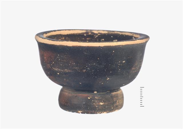 Ακέραιο σκυφίδιο χωρίς λαβές. Καλύπτεται με μαύρο γάνωμα εσωτερικά και εξωτερικά, το οποίο σε ορισμένα σημεία είναι απολεπισμένο.Η βάση του είναι χαμηλή και το σώμα του ημισφαιρικό ενώ το χείλος γυρίζει ελαφρώς προς τα έξω.