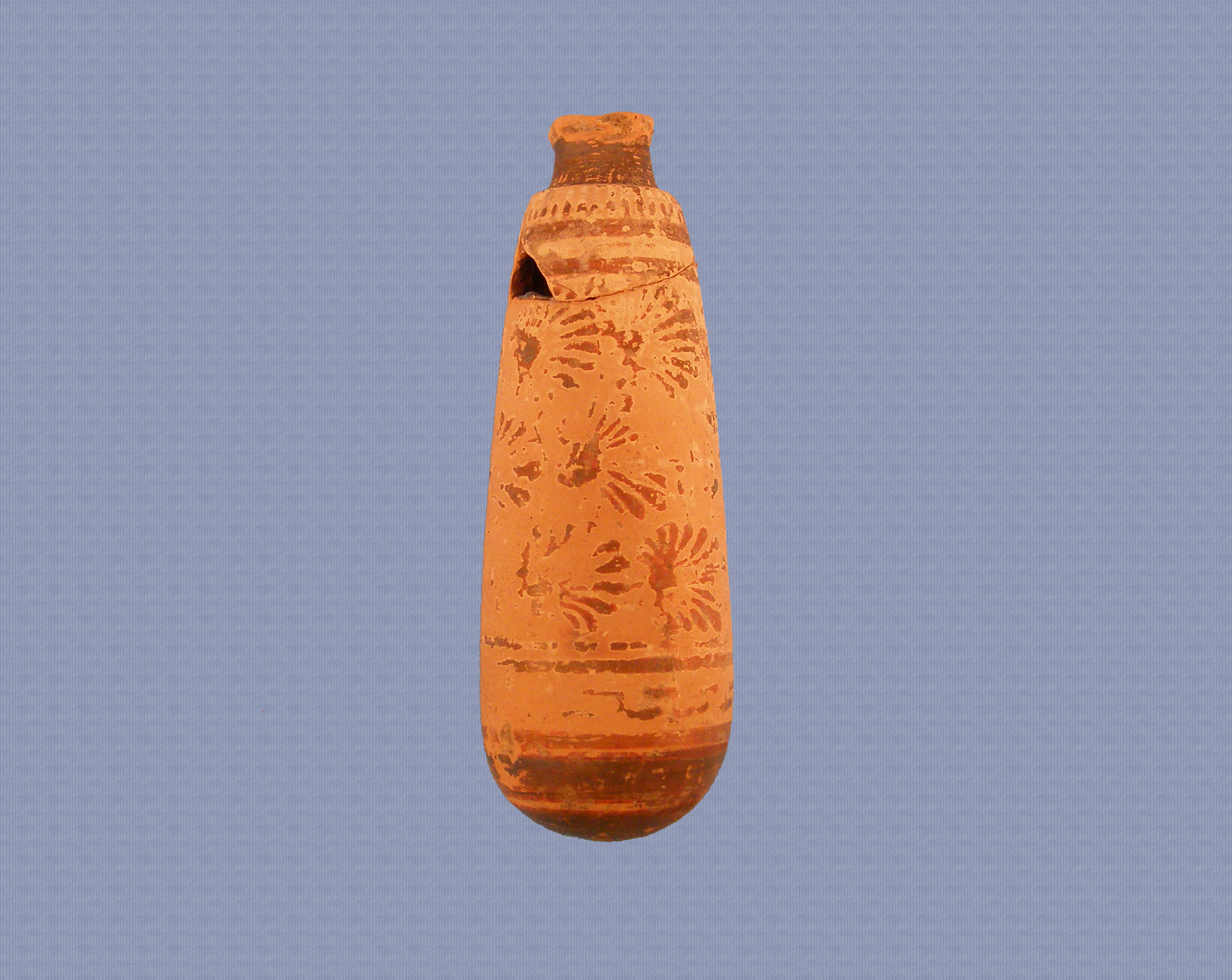 Μελανόμορφο αττικό αλάβαστρο συγκολλημένο. Ελλιπές στο χείλος και σε μικρό τμήμα του πάνω μέρους του σώματος. Το μεγαλύτερο μέρος της μελανόμορφης διακόσμησης έχει απολεπιστεί. Φέρει σώμα ωοειδές και λαιμό βραχύ κυλινδρικό. Το κάτω μέρος του σώματος κοσμείται με πλατιές καστανομέλανες ταινίες. Το σώμα διακοσμείται με τρεις σειρές πλάγιων μελανόχρωμων ανθεμίων, πλαισιωμένα κάτω από ζώνη μαιάνδρου και άνω από μία εδαφόχρωμη ταινία και ακτινωτό κόσμημα. Ο λαιμός φέρει μελανό εξίτηλο γάνωμα.