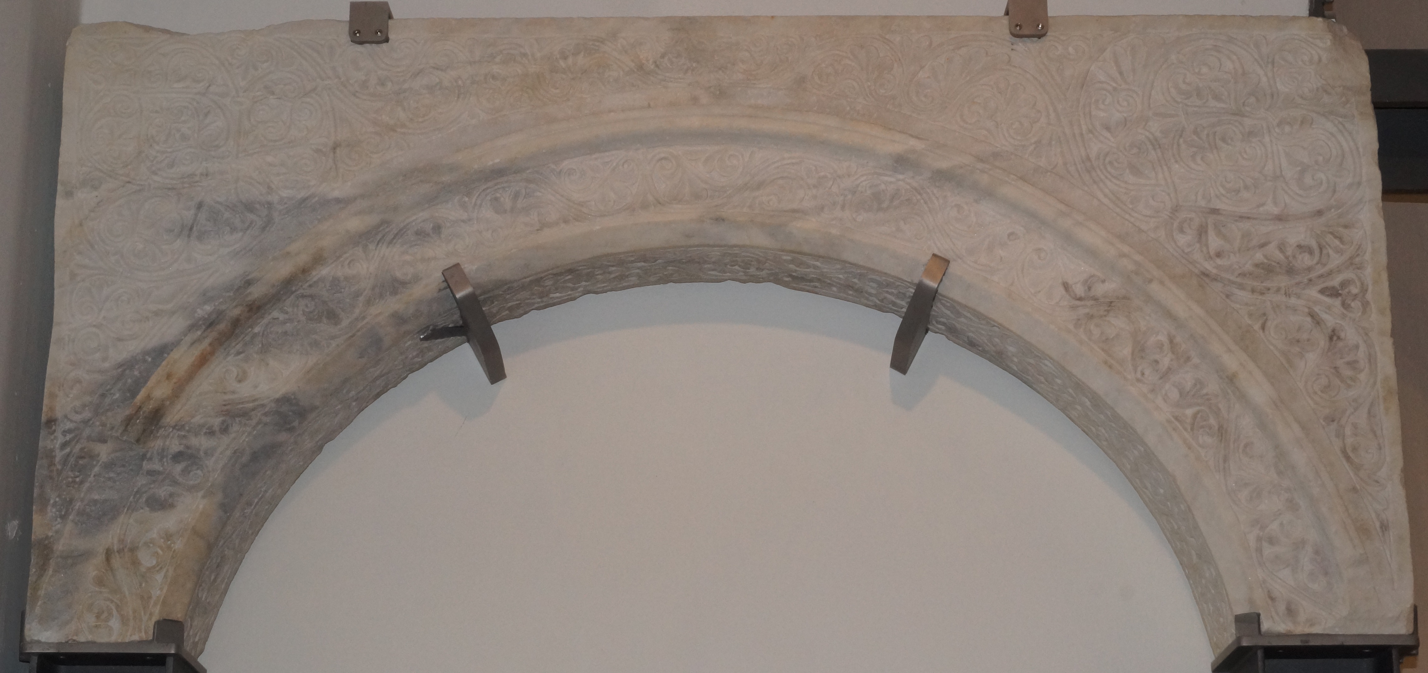 Ακέραιο μαρμάρινο τόξο. Φέρει ανάγλυφη φυτική διακόσμηση σε όλη την επιφάνειά του, καθώς και στο κάτω μέρος.