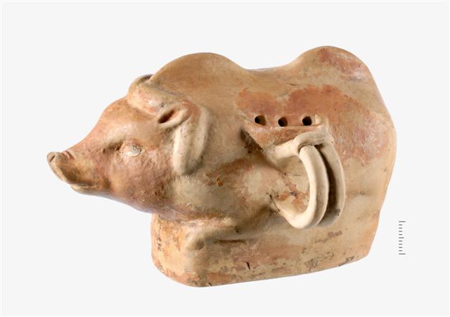 Ακέραιο θήλαστρο, με μορφή αγριόχοιρου. Το ζώο στηρίζεται σε ορθογώνια παραλληλεπίπεδη βάση και έχει λυγισμένα τα άκρα του. Στη ράχη του σχηματίζονται πλαστικές καμπύλες επιφάνειες. Αυτές, μαζί με την οφιοειδή (κυματοειδή) γραμμή που πλαισιώνει το κεφάλι, υποδηλώνουν την άγρια φύση του. Οι όγκοι στο κεφάλι δηλώνονται πλαστικά, το ρύγχος είναι οξύ με κοίλα ρουθούνια, στο στόμα υπάρχει μικρή οπή για την εκροή του υγρού. Τα μάτια είναι κοίλα, με ανάγλυφες κόρες. Στο αριστερό μάτι διακρίνονται ίχνη επίθετου λευκού και μαύρου χρώματος. Ανάγλυφα δηλώνονται επίσης τα αυτιά και η ουρά. Στο σώμα παρατηρείται σχετικά πλαστική διαμόρφωση των ανατομικών όγκων. Στην πλάγια επιφάνεια του σώματος, υπάρχει μια επίθετη καμπύλη που σχηματίζει κοιλότητα και πλαισιώνει δύο οριζόντιες σειρές οπών, τρεις στην πρώτη σειρά, δύο στη δεύτερη, για το γέμισμα του θηλάστρου· Ενωμένη με την καμπύλη επιφάνεια είναι η διπλή κάθετη κυκλική λαβή, κυλινδρικής διατομής. Τα δύο στελέχη της λαβής ενώνονται στο πάνω μέρος τους με οριζόντιο επίπεδο επίθημα πηλού. Κατά τόπους στο σώμα, αλλά και στη βάση, υπάρχουν τμήματα με στιλβωμένο ερυθροκίτρινο επίχρισμα που τονίζει ακόμη περισσότερο την πλαστικότητα του σώματος.