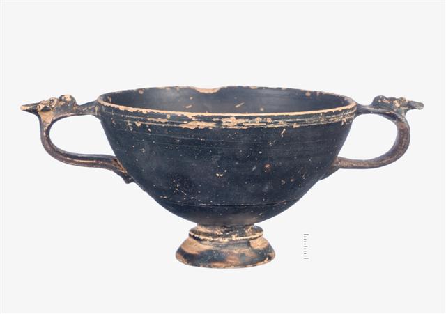 Μελαμβαφής κάνθαρος. Ελλιπής στο κάτω τμήμα της μιας λαβής. Φέρει ελαφρά απόκρουση στο χείλος. Το μελανό γάνωμα έχει υποστεί μικρές φθορές σε λίγα σημεία. Στο χείλος υπήρχε ζώνη φυτικής διακόσμησης (τύπου δυτικής κλιτύος) με λευκό επίθετο χρώμα, που έχει απαλειφθεί. Φέρει βάση σε σχήμα ανεστραμμένου κώνου με επίθετο πλαστικό δακτύλιο και σώμα ημισφαιρικό με βραχύ στέλεχος. Οι λαβές είναι κάθετες ταινιωτές με μικρές ελεύθερες αποφύσεις στη ράχη του που έχουν την μορφή πλαστικών γενειοφόρων προσωπείων. Στην κοιλιά φέρει αυλάκωση.