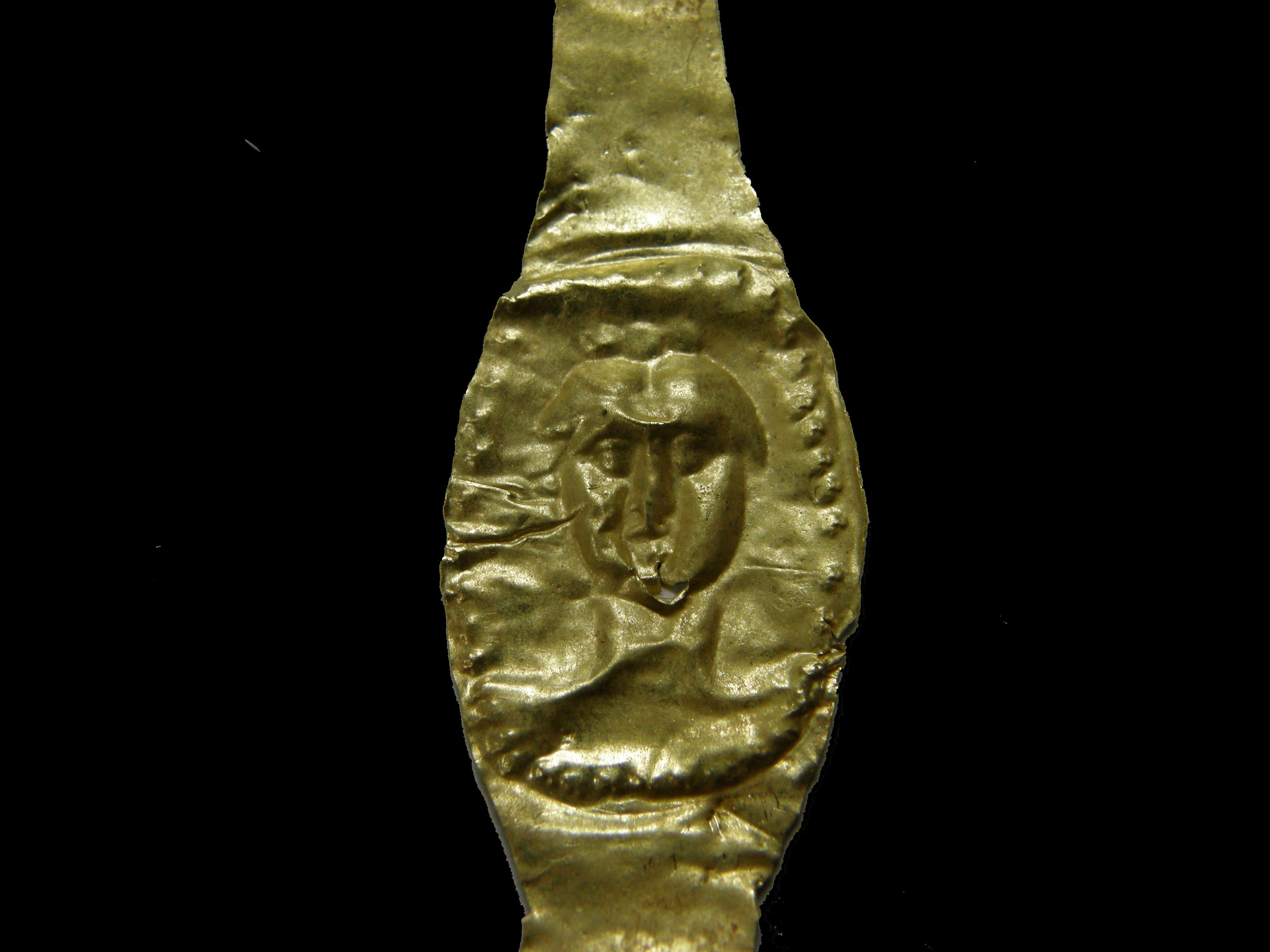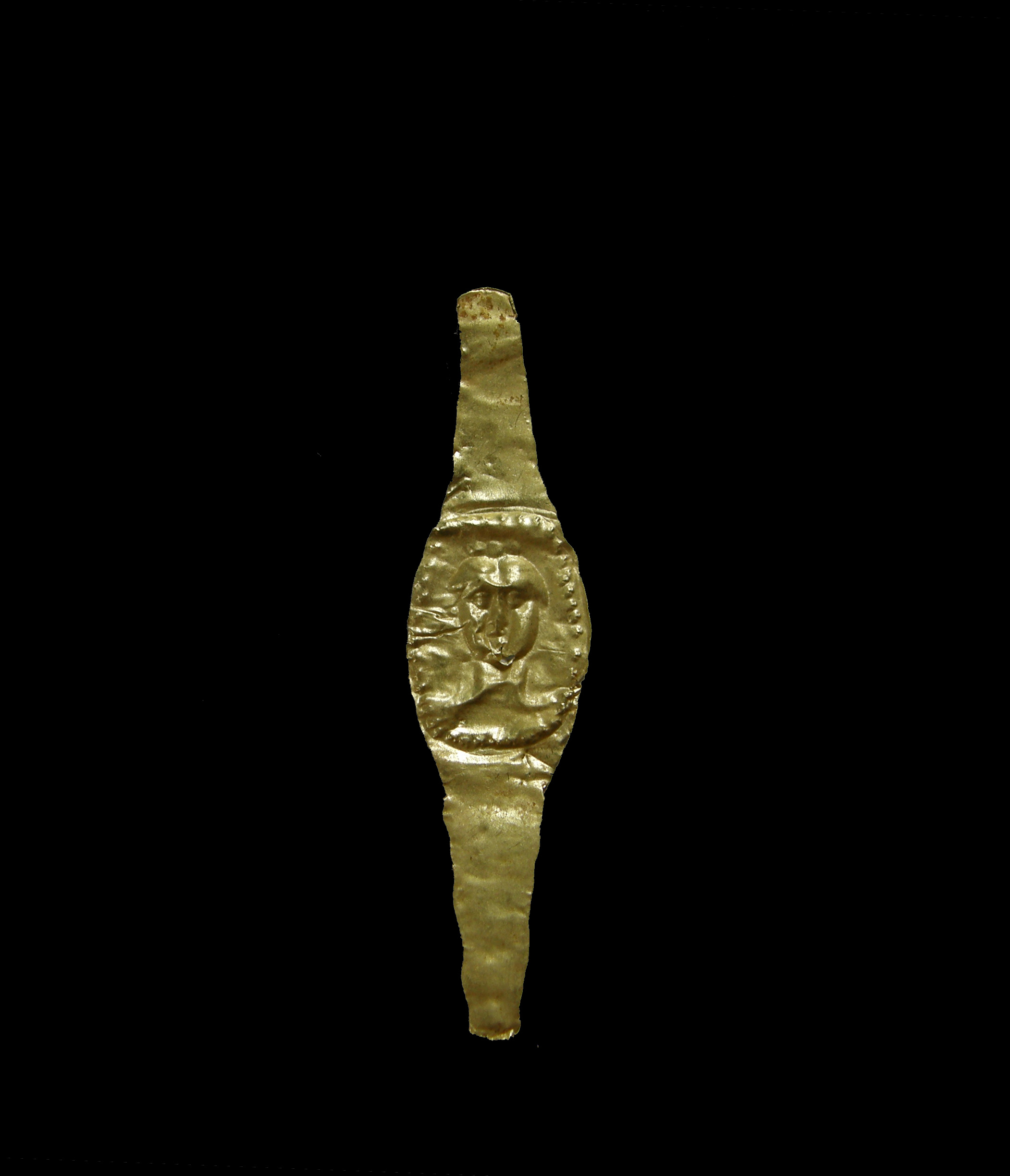 Χρυσό έλασμα, πιθανώς δακτύλιος, που διευρύνεται προς το μέσο. Στο μέσο, σε ωοειδή σφενδόνη με κοκκιδωτό περίγραμμα εικονίζεται προτομή ανδρικής μορφής με αδρά χαρακτηριστικά. Η μορφή φέρει λίγες φθορές στο πηγούνι. Η διακόσμηση της σφενδόνης είναι έκτυπη, σφυρήλατη.