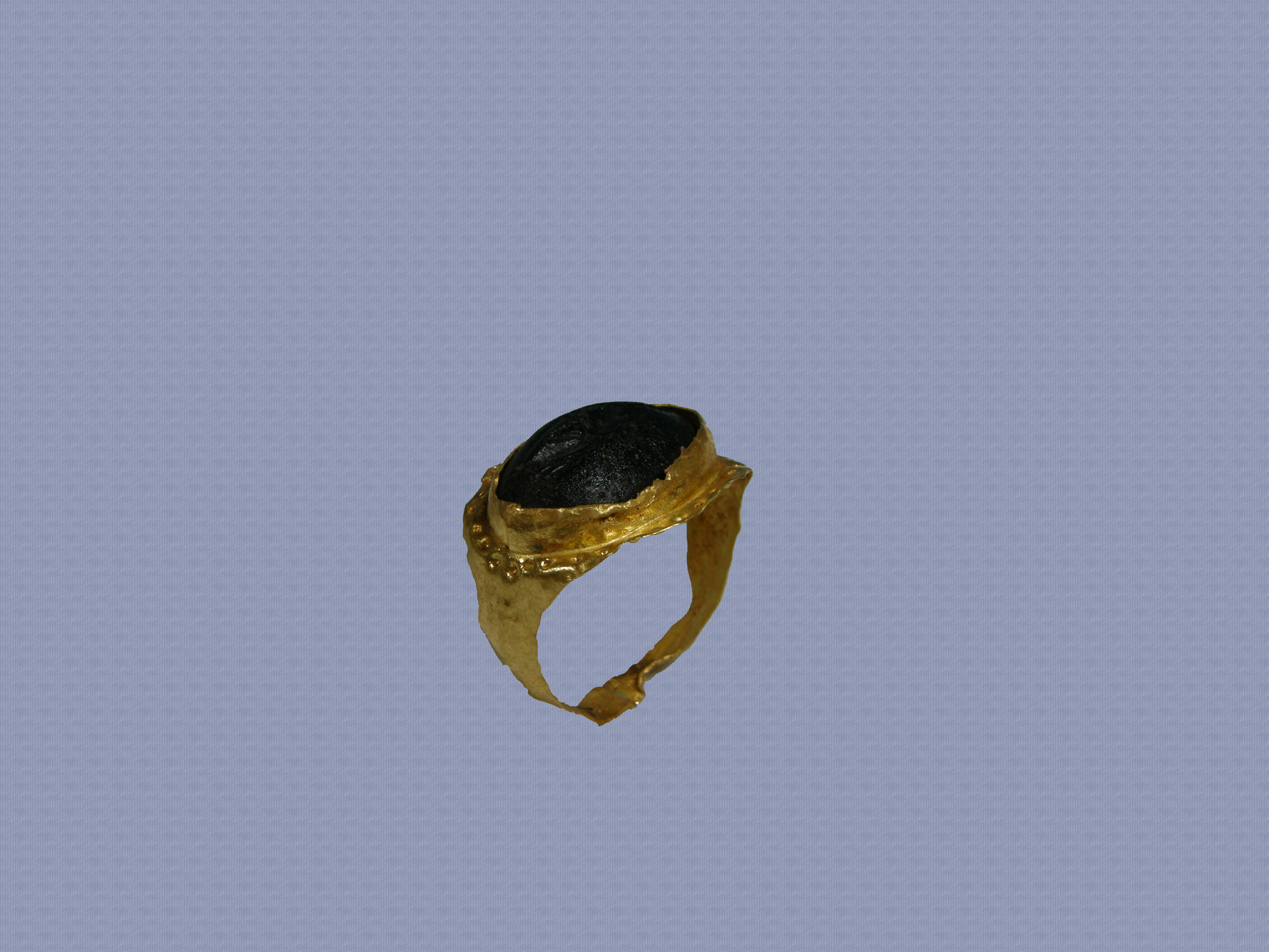 Χρυσός δακτύλιος. Αποτελείται από ελασμάτινο κρίκο, ο οποίος διευρύνεται προς το άνω μέρος του δακτυλίου σχηματίζοντας ωοειδή, ελασμάτινη σφενδόνη και ωοειδή θήκη, όπου συγκρατείται υαλόμαζα χρώματος βαθέος κυανού. Στην επιφάνειά της φέρει έντυπη παράσταση όρθιας ημίγυμνης ανδρικής μορφής (Απόλλων;). Ο κορμός παρίσταται κατ' ενώπιον με σιγμοειδή κίνηση και η κεφαλή με κοντή κόμη και διάδημα στρέφεται προς τα αριστερά. Το κάτω μέρος του σώματος καλύπτει ιμάτιο. Στο αριστερό χέρι, που τείνεται προς τα δεξιά, κρατά οινοχόη. Με το δεξί χέρι στηρίζεται σε κιονίσκο. Η μορφή πατά σε έντυπη γραμμή εδάφους. Στην περιφέρεια της σφενδόνης έντυπες στιγμές.