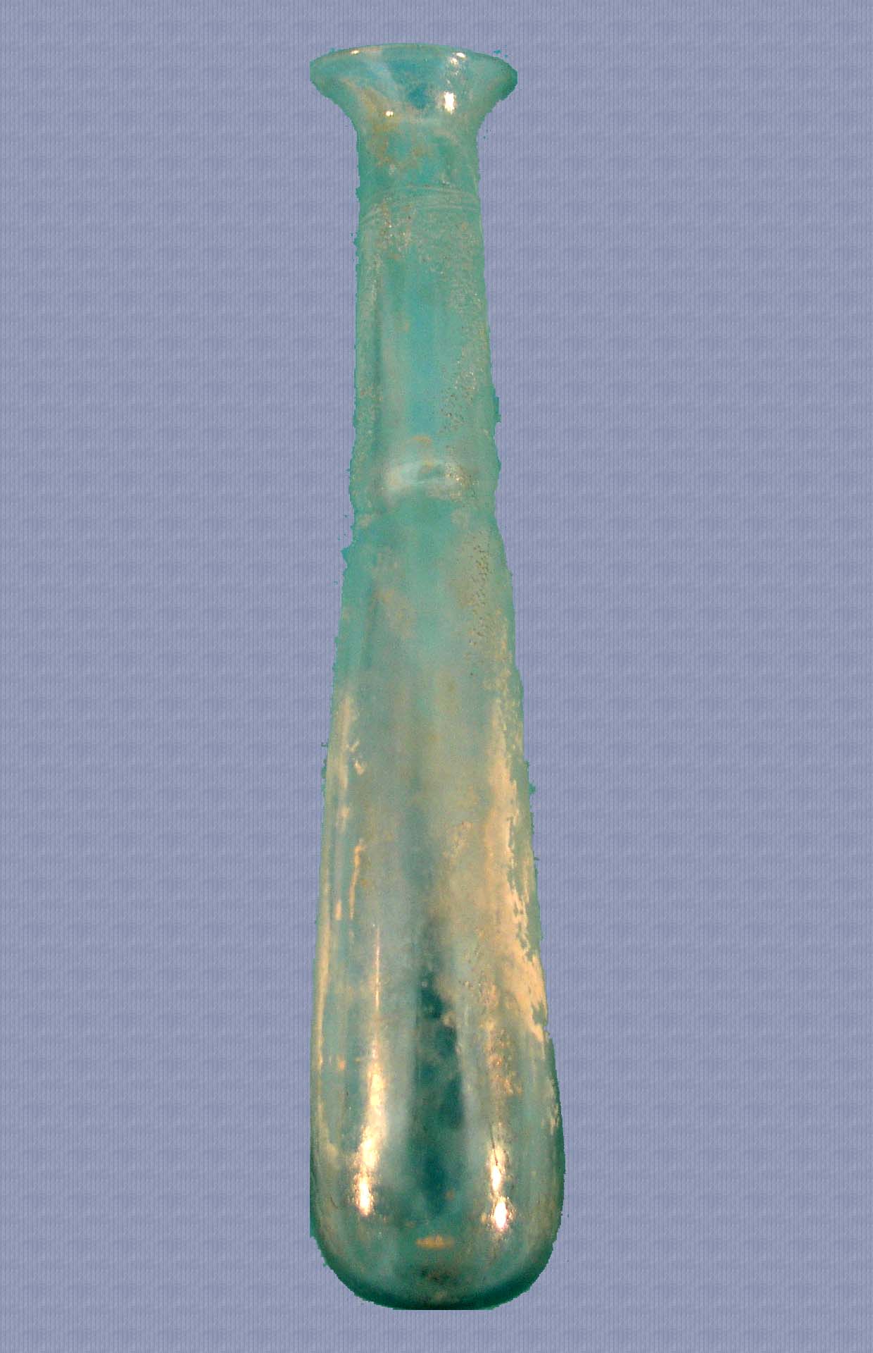 Ακέραιο γυάλινο μυροδοχείο. Η επιφάνεια στήριξης είναι επίπεδη. Σώμα δακρυόσχημο, μεταβαίνει ομαλά με αβαθή αυλάκωση σε ψηλό, στενό, κυλινδρικό λαιμό. Το χείλος βγαίνει προς τα έξω και έχει σχήμα χωνιού