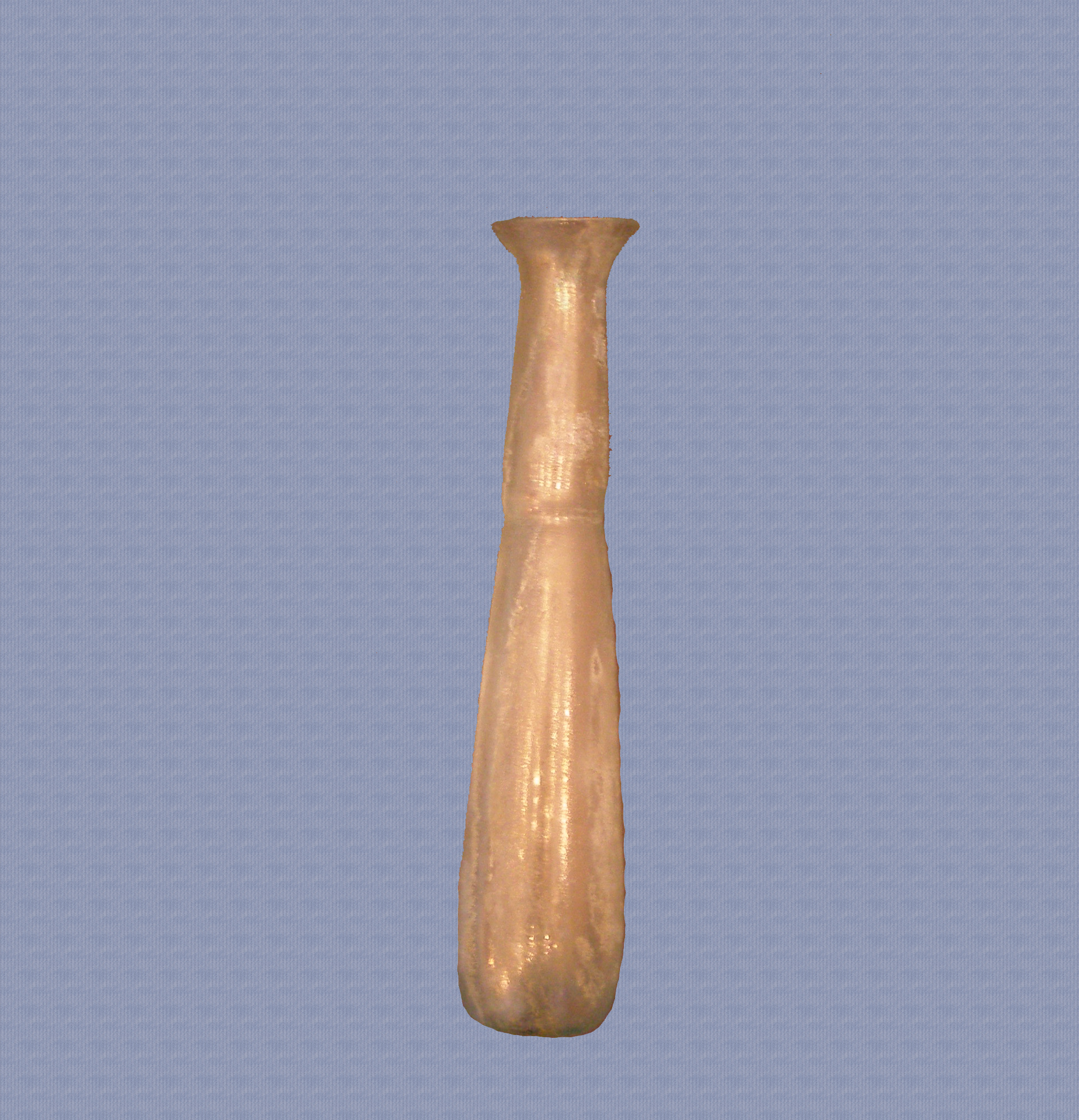 Ακέραιο γυάλινο μυροδοχείο. Σώμα στενό, επίμηκες κυλινδρικό, λαιμός ψηλός κυλινδρικός και χείλος σε σχήμα χωνιού. Γυαλί φυσητό, ημιδιαφανές.