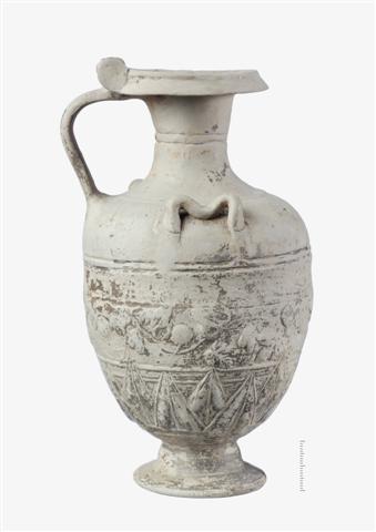 Το σώμα της υδρίας είναι ωοειδές και καταλήγει σε χαμηλό πόδι, που μαζί με την πλατιά δακτυλιόσχημη βάση (πλ. 0,011 μ.) θυμίζει ανεστραμμένο κάλυκα. Το σώμα έχει ανάγλυφη διακόσμηση μαγαρικού τύπου (του τύπου των μεγαρικών σκύφων). Αρχικά, υπάρχουν δύο έντονα εγχάρακτοι δακτύλιοι. Σε απόσταση 0,012 μ. έχουν χαραχθεί δύο (2) άλλοι λεπτότεροι. Ακολουθεί η κυρίως ανάγλυφη διακόσμηση, με μια πρώτη ζώνη, πλάτους 0,023 μ. αποτελούμενη από βλαστόσπειρες, κισσόφυλλα και αμπελόφυλλα, καθώς και ανάγλυφα δισκάρια (πιθανότατα σχηματοποιημένοι καρποί). Ακολουθεί δεύτερη πλατύτερη ζώνη (πλ. 0,031 μ.), με ανάγλυφη διακόσμηση που πλαισιώνεται πάνω και κάτω από ζεύγη ανάγλυφων δακτυλίων. Εδώ, το μοτίβο συνιστούν μικρά, σχηματοποιημένα λογχόσχημα φύλλα που εναλλάσσονται με άλλα μεγαλύτερα. Οι διπλοί ανάγλυφοι δακτύλιοι δεν περιορίζουν τη ζώνη, καθώς το πάνω πέρας της το παραβιάζουν οι οξείες απολήξεις των μικρών λογχόσχημων φύλλων, ενώ το κάτω πέρας το ξεπερνά το πεπλατυσμένο άκρο κάθε δεύτερου μεγάλου λογχόσχημου φύλλου. Σε όλη την επιφάνεια του αγγείου, ακόμη και στην αθέατη επιφάνεια στήριξης, διακρίνονται ίχνη καστανομέλανου χρώματος.