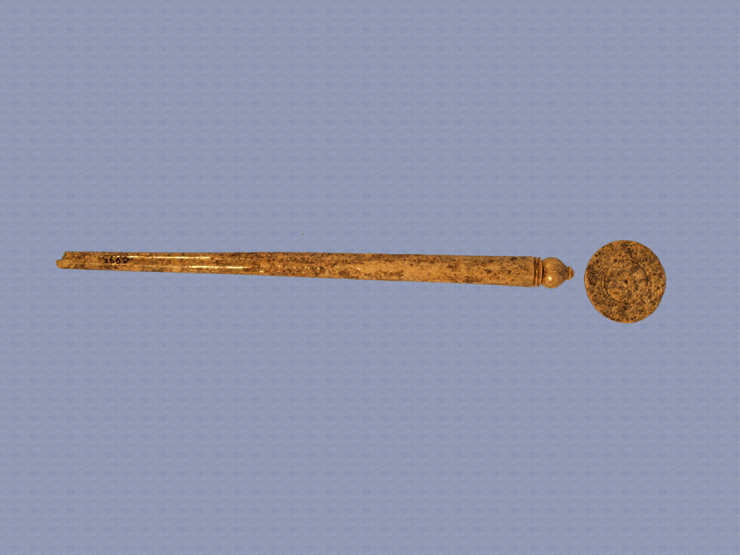 Οστέινη περόνη, ελλιπήςκαι συγκολλημένη από δύο κομμάτια. Το κυλινδρικής τομής στέλεχος στενεύει προοδευτικά προς το μυτερό άκρο που είναι σπασμένο. Η κεφαλή έχει σχήμα μήκωνος και απολήγει σε δισκάριο με κυλινδρική αποκεκρουμένη κορύφωση. Κάτω από αυτή δικαρίνονται τρεις βαθειές περιμετρικές αυλακώσεις. Η επιφάνεια του στελέχους φέρει κατά τόπους αποκρούσεις.