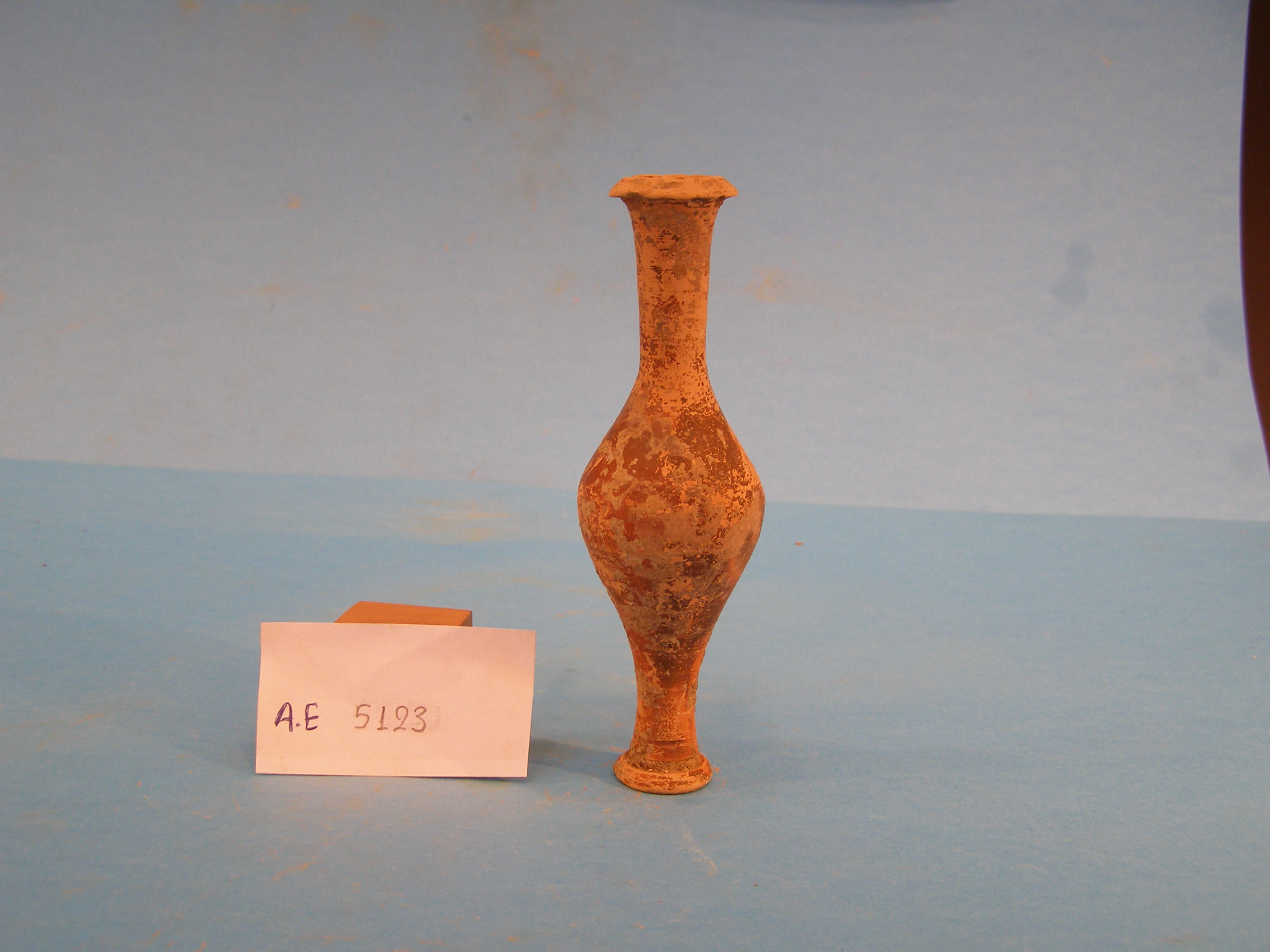 Μελαμβαφές μυροδοχείο, ακέραιο, εκτός από ελαφρότατη απόκρουση στο λοξότμητο χείλος. Φέρει δισκόμορφη βάση, η οποία διαχωρίζεται με αύλακα από το κυλινδρικό, ψηλό πόδι. Το απιόσχημο σώμα έχει τη μέγιστη διάμετρό του στο μέσο του ύψους του, ενώ ο λαιμός είναι ψηλός. Η καστανομέλανη βαφή είναι εξίτηλη και απολεπισμένη. Επίπαγος καλύπτει μεγάλο μέρος του μυροδοχείου.