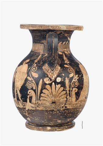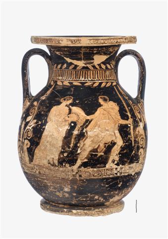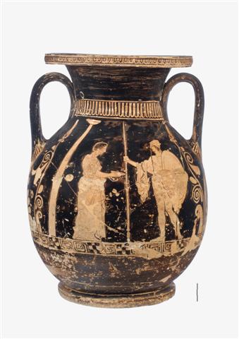 Πελίκη ερυθρόμορφη, με παράσταση πολεμιστή και γυναικείας μορφής στη μία όψη και παράσταση αποχαιρετισμού στην άλλη.