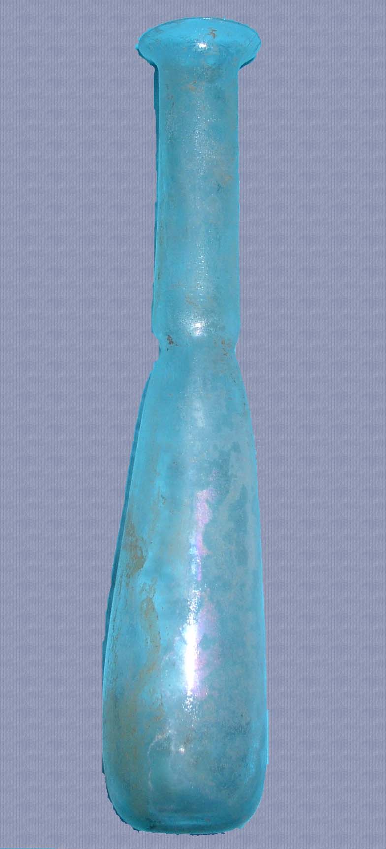 Ακέραιο γυάλινο μυροδοχείο. Η επιφάνεια στήριξης είναι επίπεδη. Σώμα δακρυόσχημο, μεταβαίνει ομαλά με αβαθή αυλάκωση σε ψηλό, στενό, κυλινδρικό λαιμό, χείλος έξω νεύον χοανόσχημο.