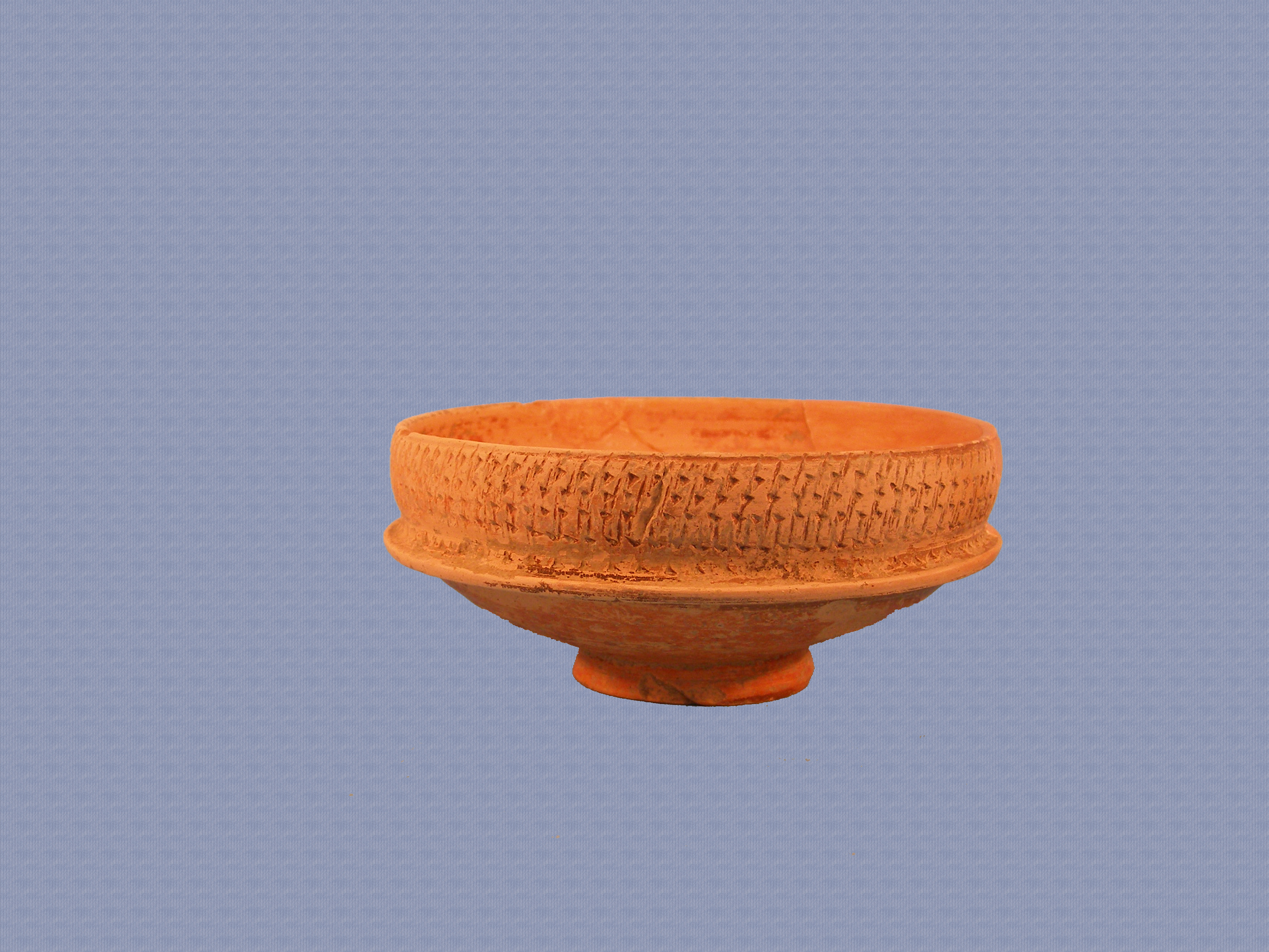 Φιάλη, συγκολλημένη και συμπληρωμένη στο χείλος, αποκεκρουμένη κατά τόπους. Έχει βάση κωνική δακτυλιόσχημη, σώμα με εναλλασσόμενη εμπίεστη τριγωνική και εγχάρακτη γραμμική διακόσμηση, διατεταγμένη σε πέντε σειρές. Στη βάση του χείλους διαμορφώνεται προεξέχων δακτύλιος και στην παρυφή του δεύτερος λεπτός και εγχάρακτος. Φέρει πορτοκαλέρυθρο εξίτηλο επίχρισμα.