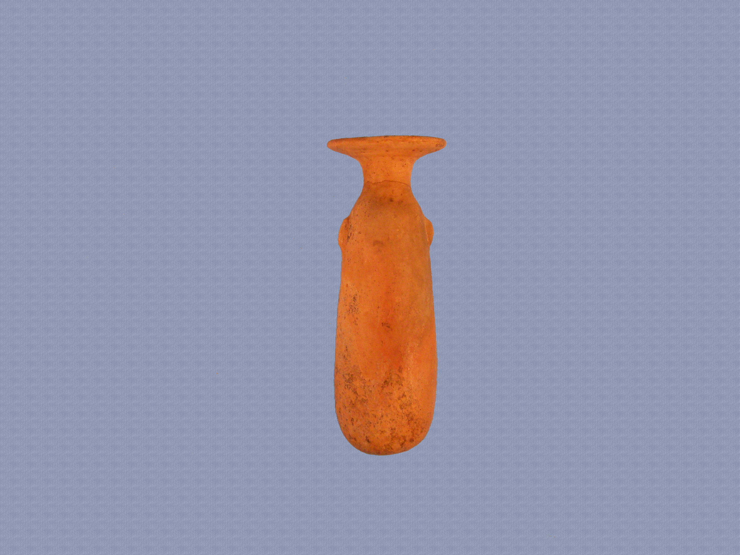 Ακέραιο αλάβαστρο. Φέρει σώμα επίμηκες, ωοειδές, που στενεύει προς τα άνω σε κοντό κυλινδρικό λαιμό και δακτυλιόσχημο στόμιο με πλατύ περιχείλωμα. Στο άνω μέρος του σώματος, κοντά στο λαιμό διακρίνονται δυο πλαστικά ωτία.