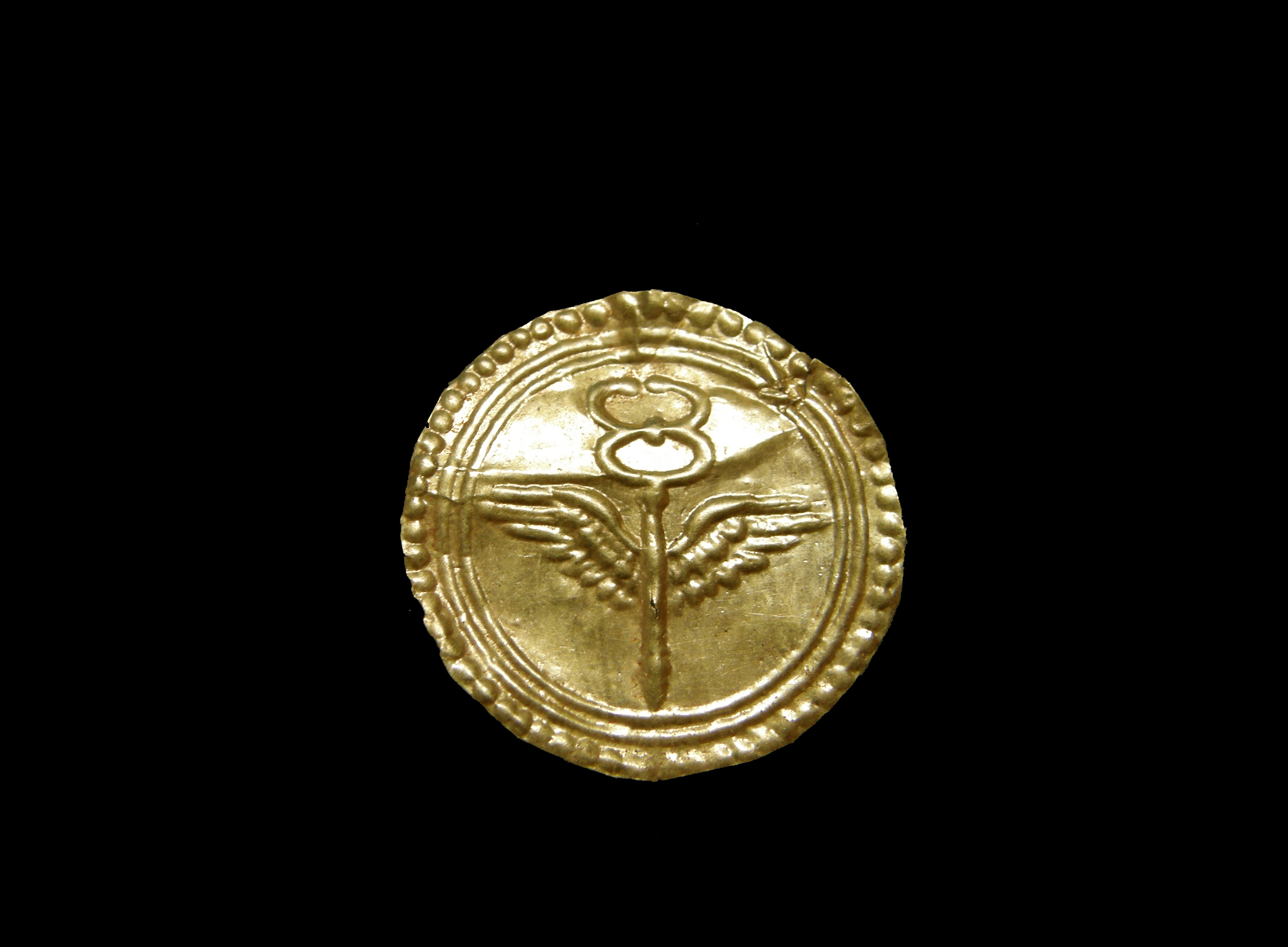 Ελασμάτινη χρυσή δανάκη με κηρύκειο.