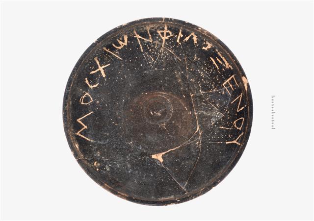 Πινάκιο σε β' χρήση ως πώμα τεφροδόχου αμφορέα (ΑΕ2932), συγκολλημένο από πολλά κομμάτια. Φέρει βάση δακτυλιόσχημη, σώμα βαθύ και χείλος κάθετο. Σώζει μελανό χρώμα στην εσωτερική και σε μέρος της εξωτερικής επιφάνειας. Το κατώτερο μέρος του σώματος και η βάση έχουν μείνει άβαφα. Στην εσωτερική επιφάνεια του σώματος σώζει εγχάρακτη επιγραφή: " ΜΟCΧΙΩΝ ΦΙΛΟΞΕΝΟΥ ".