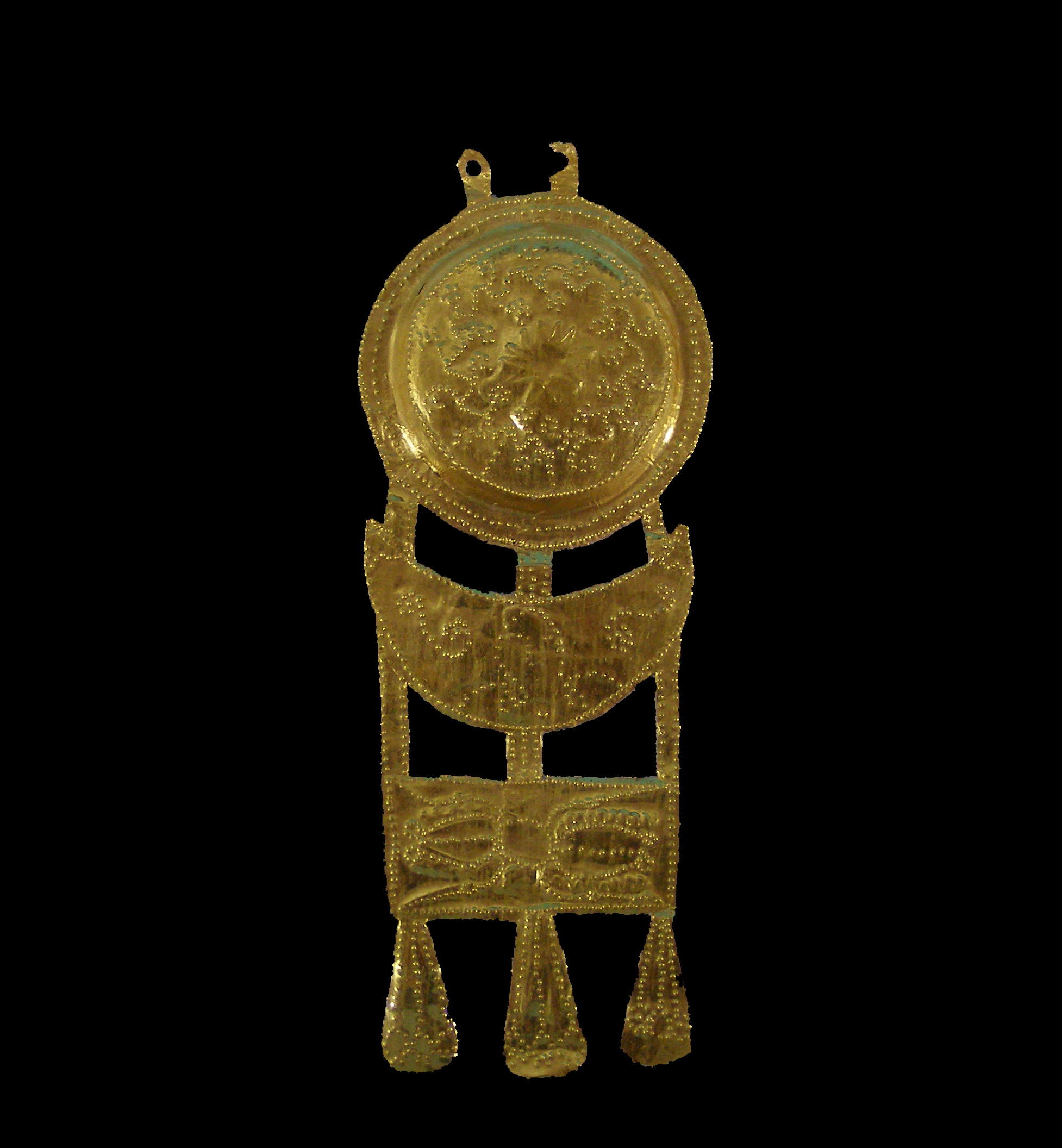 Χρυσό ελασμάτινο τριμερές περίαπτο. Αποτελείται από ένα ασπιδόμορφο έλασμα, το οποίο στο πάνω μέρος του έχει δύο συμφυείς μικρούς κρίκους πρόσδεσης και στο κάτω μέρος του τρία συμφυή κάθετα ελάσματα, με φυλλόσχημη απόληξη. Οριζόντια σε αυτά συμφύονται ένα μηνοειδές και ένα ορθογώνιο έλασμα.