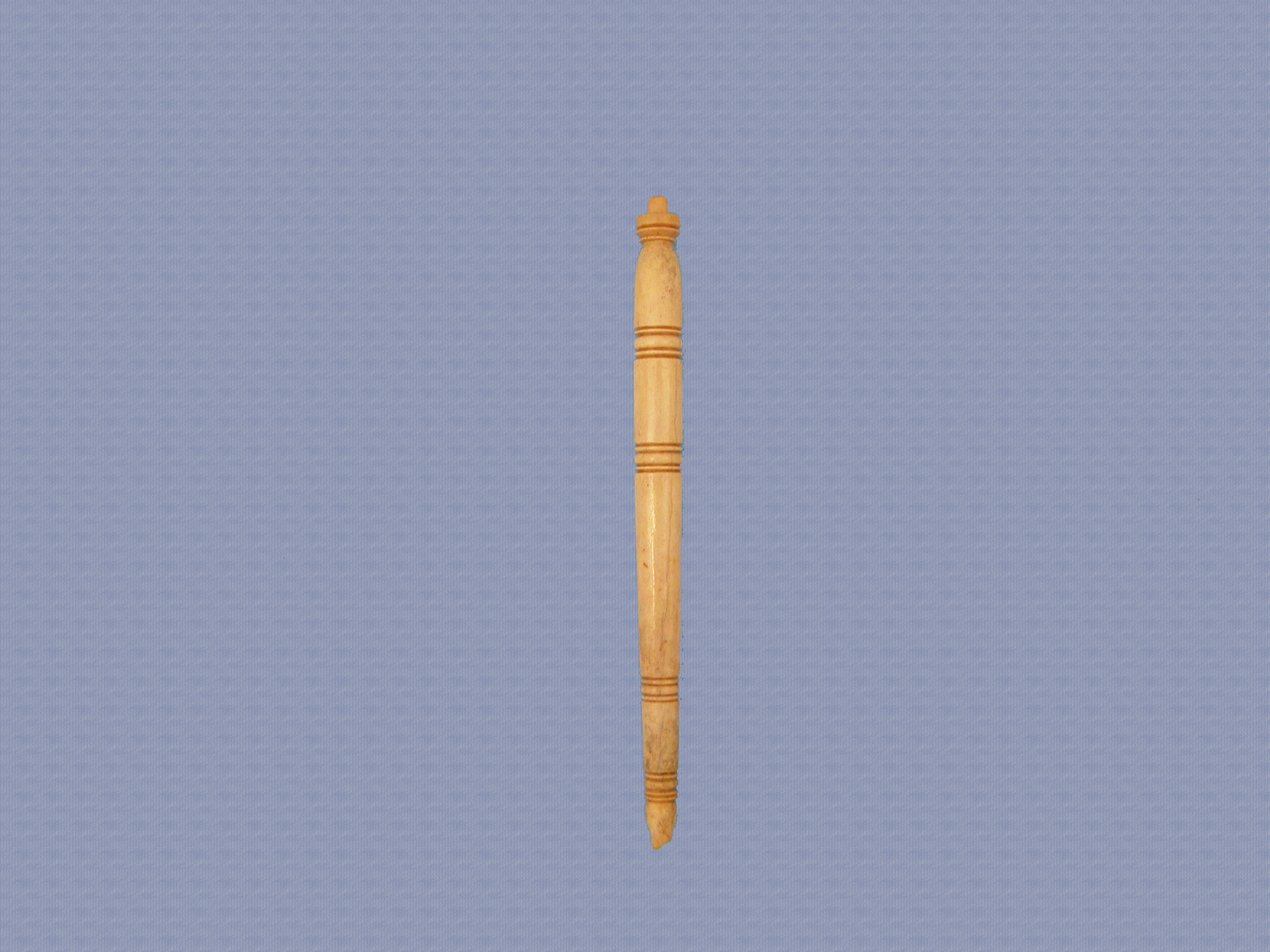 Οστέινη περόνη, ελλιπής. Το κυλινδρικής τομής στέλεχος στενεύει ελαφρά από την κορυφή προς τα κάτω, όπου είναι σπασμένο και φέρει 8 ζεύγη περιμετρικών αυλακώσεων, διατεταγμένα ανά δύο. Η κεφαλή είναι δισκοειδής και φέρει τρεις (3) εγχάρακτους δακτυλίους στο κάτω μέρος και κάθετο έξαρμα στην πάνω επιφάνεια με οπή στο μέσο.
