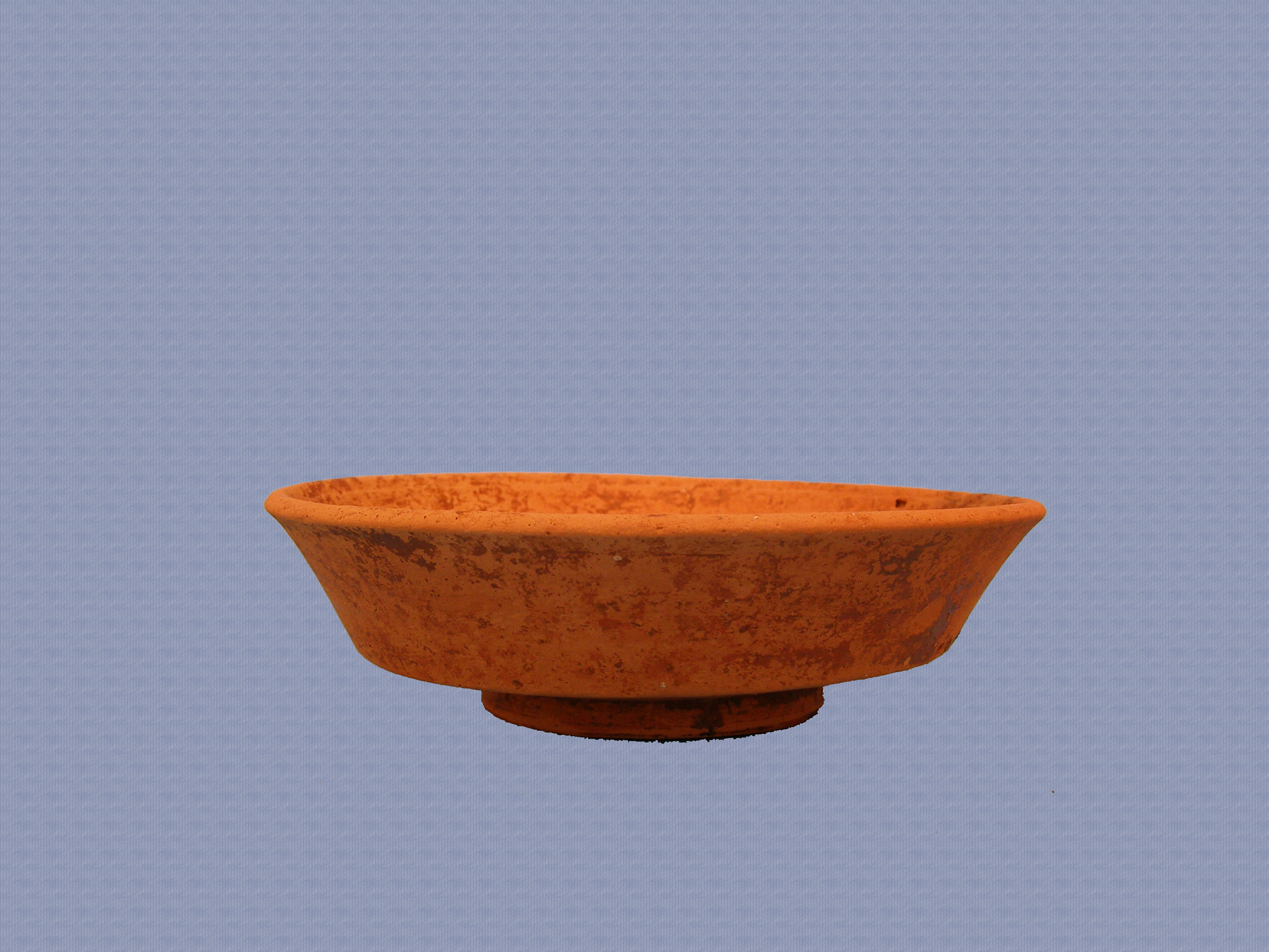 Πινάκιο (πιάτο). Έχει βάση δακτυλιόσχημη με δεύτερο εσωτερικό κοίλωμα και ομόκεντρες εγχαράξεις. Το σώμα είναι βαθύ με τοιχώματα προς τα έξω και χείλος παχύ με αβαθές αυλάκι. Φέρει πορτοκαλόχρωμο επίχρισμα απολεπισμένο, το οποίο σώζεται καλύτερα στη βάση και λιγότερο στο κατώτερο τμήμα του σώματος.