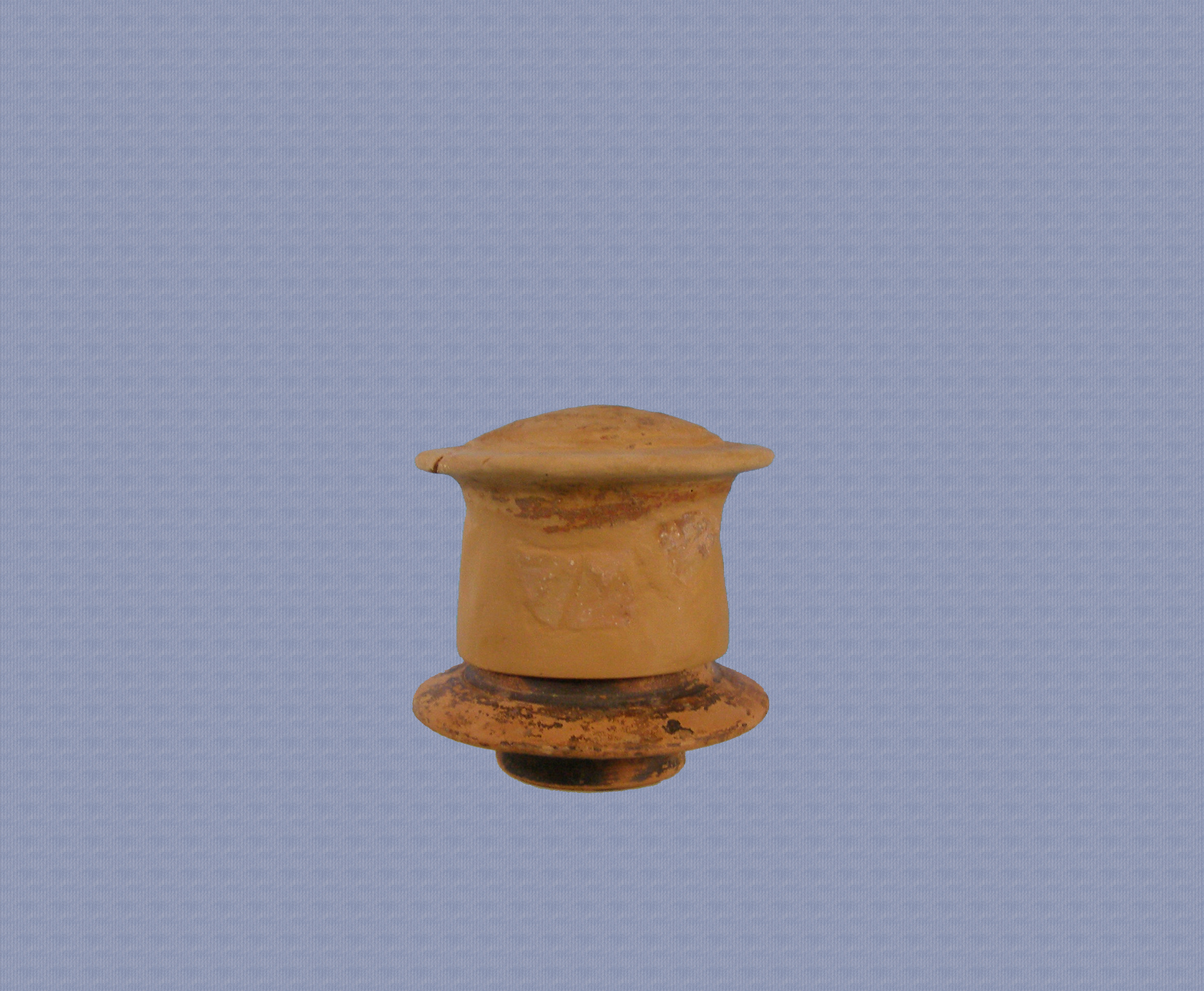 Mελαμβαφής κυλινδρική πυξίδα με πώμα. Φέρει καστανό απολεπισμένο γάνωμα. Έχει δακτυλιοειδή βάση, κυλινδρικό σώμα με ελαφρά συγκλίνοντα τοιχώματα και πλατύ δισκοειδή περίγυρο. Το πώμα έχει κυλινδρικό τοίχωμα, πλατύ περίγυρο και ασπιδωτό θόλο. Το κέντρο του θόλου ορίζουν δύο εγχάρακτοι ομόκεντροι κύκλοι.