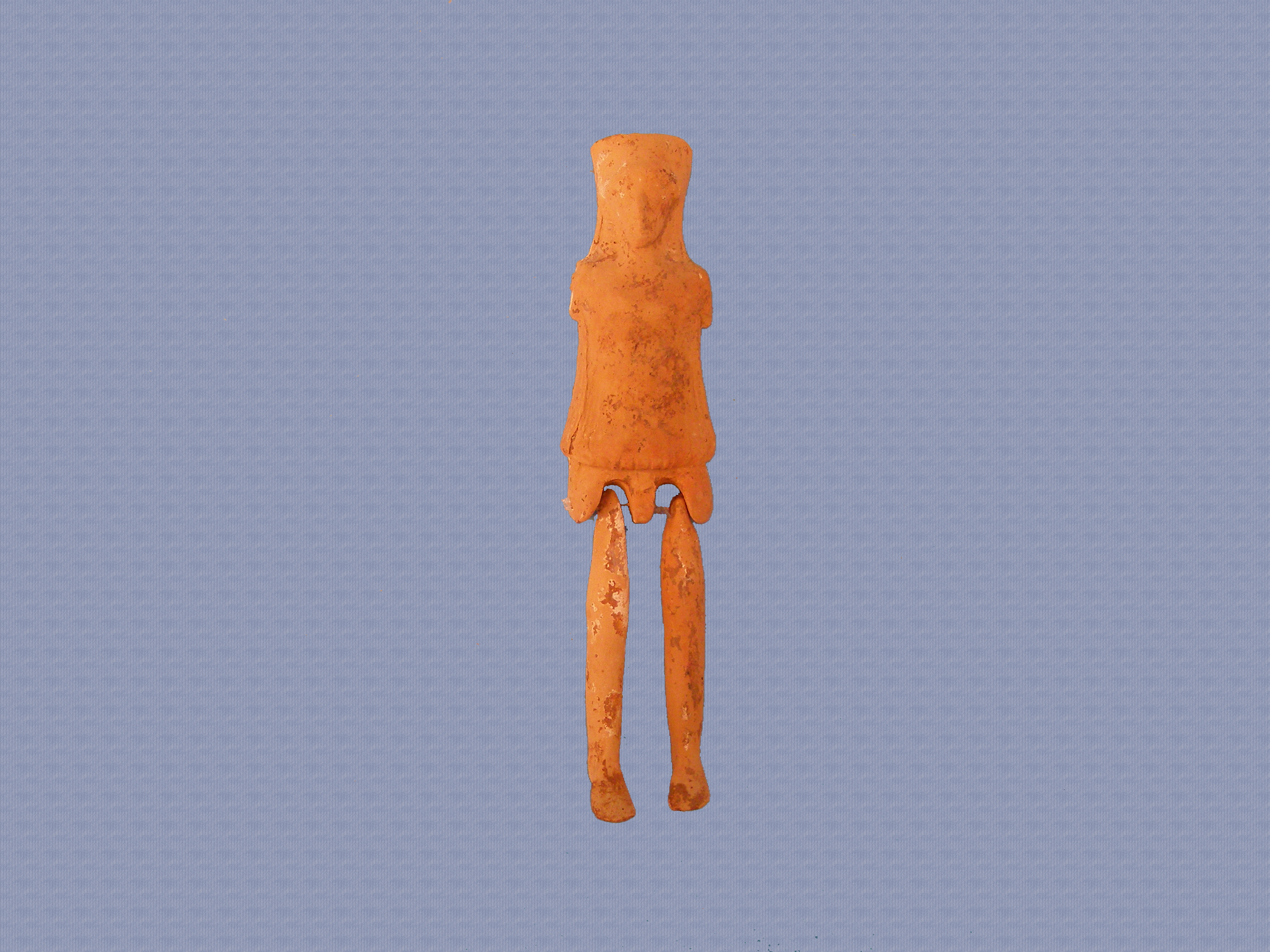 Πλαγγόνα στον τύπο του νευρόσπαστου. Ελλιπής στο άνω δεξί κινητό μέλος-χέρι και τμήμα του δεξιού. Το δεξί κάτω άκρο είναι προσαρτημένο στον κορμό με πετονιά. Πρόκειται για μετωπική γυναικεία μορφή αποδοσμένη σχηματικά. Το πρόσωπο είναι ωοειδές με δυσδιάκριτα χαρακτηριστικά. Φέρει πόλο στην κεφαλή και έχει μακριά κόμη, η οποία αποδίδεται με κυματοειδείς οριζόντιες εγχαράξεις και πλαισιώνει δεξιά και αριστερά το πρόσωπο φτάνοντας έως το ύψος των ώμων. Φοράει κοντό χιτωνίσκο. Η οπίσθια όψη είναι επιπεδόμορφη χωρίς ανατομικές λεπτομέρειες. Διατηρεί ίχνη λευκού και ερυθρού επιχρίσματος κατά τόπους. Στο πάνω μέρος της κεφαλής φέρει μικρή οπή όπτησης.