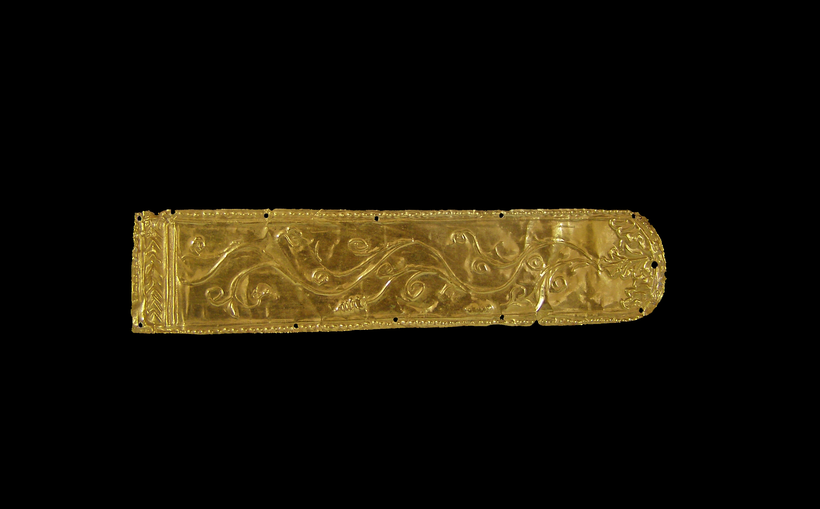 Χρυσό έλασμα ορθογωνίου σχήματος (πιθανώς τμήμα διαδήματος) με ημικυκλική τη μια στενή πλευρά του και μια εγκοπή φθοράς στην άλλη στενή πλευρά του. Κοσμείται κατά πλάτος με έκτυπη βλαστόσπειρα κισσού. Στο ένα άκρο κοσμείται με έκτυπο κάθετο κλαδί δάφνης, πλαισιωμένο από παράλληλες έκτυπες γραμμές. Στο ημικυκλικό του άκρο φέρει έκτυπο πεντάφυλλο οριζόντιο ανθέμιο με δυο ημιανθέμια εκατέρωθεν. Η παράσταση πλαισιώνεται περιφεριακά από σειρά "χτυπητών" στιγμών και έχει έντεκα οπές πρόσδεσης.