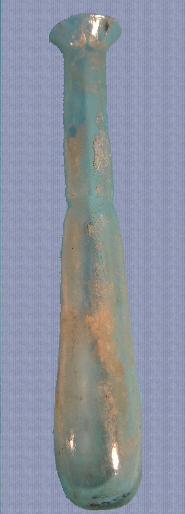 Ακέραιο γυάλινο μυροδοχείο. Η επιφάνεια στήριξης είναι επίπεδη. Σώμα δακρυόσχημο, μεταβαίνει ομαλά με αβαθή αυλάκωση σε ψηλό, στενό, κυλινδρικό λαιμό, χείλος έξω νεύον χοανόσχημο.