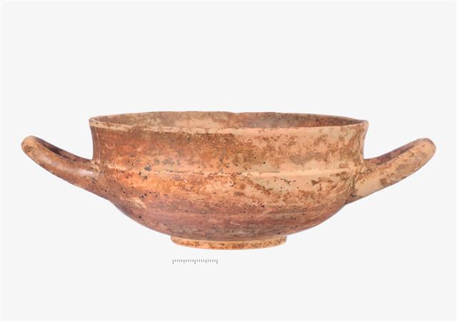 Ακέραιη απους κύλικα. Φέρει δύο κάθετα ραγίσματα. Βάση χαμηλή δισκοειδής, σώμα με κοιλόκυρτο περίγραμμα, γωνίωση στη μετάβαση από το σώμα στο έξω νεύον χείλος. Λαβές κυλινδρικής διατομής, οριζόντιες. Επίχρισμα καστανέρυθρο εξίτηλο, απολεπισμένο. 'Ιχνη από μελανό γάνωμα στο σώμα.
