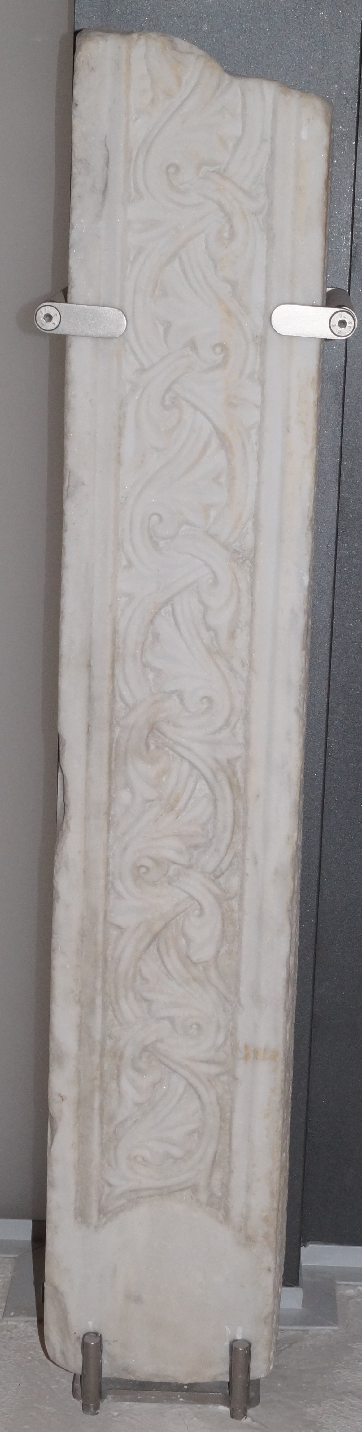 Πεσσίσκος τέμπλου σπασμένος στο κάτω μέρος και με φθορές σε διάφορα σημεία .Φέρει διακόσμηση στη μια από τις τέσσερις πλευρές, ενώ οι υπόλοιπες δυο είναι καλά λειασμένες, και μία αδρά . Η διακόσμηση συνίσταται σε ελικοειδή τριμερή βλαστό που απολήγει σε ημιανθέμια , τα οποία γεμίζουν τις καμπύλες του . Το πλαίσιο αποτελείται από ακόσμητη ταινία και κυμάτιο τριγωνικής διατομής.