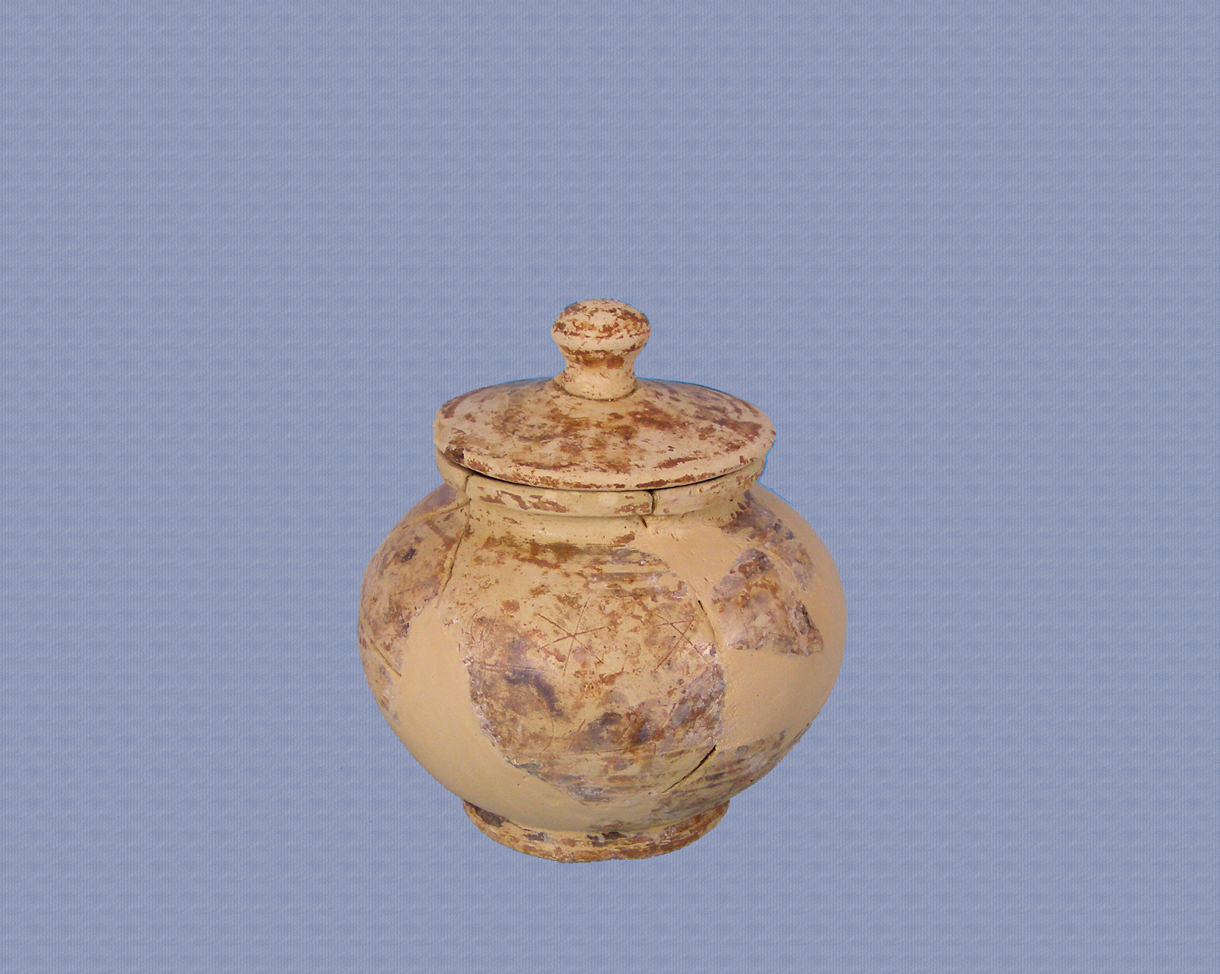 Κορινθιακή σφαιρική πυξίδα με πώμα. Είναι συγκολλημένη αππό αρκετά θραύσματα και συμπληρωμένη σε ορισμένα τμήματα του σώματος. Η βάση της είναι πολύ χαμηλή δακτυλιόσχημη, το σώμα είναι σφαιρικό και το χείλος της οριζόντιο. Το πώμα έχει επίπεδα τοιχώματα και κομβιόσχημη λαβή. Στο σώμα διακρίνονται ίχνη από ζώα και εγχάρακτοι ρόδακες.
