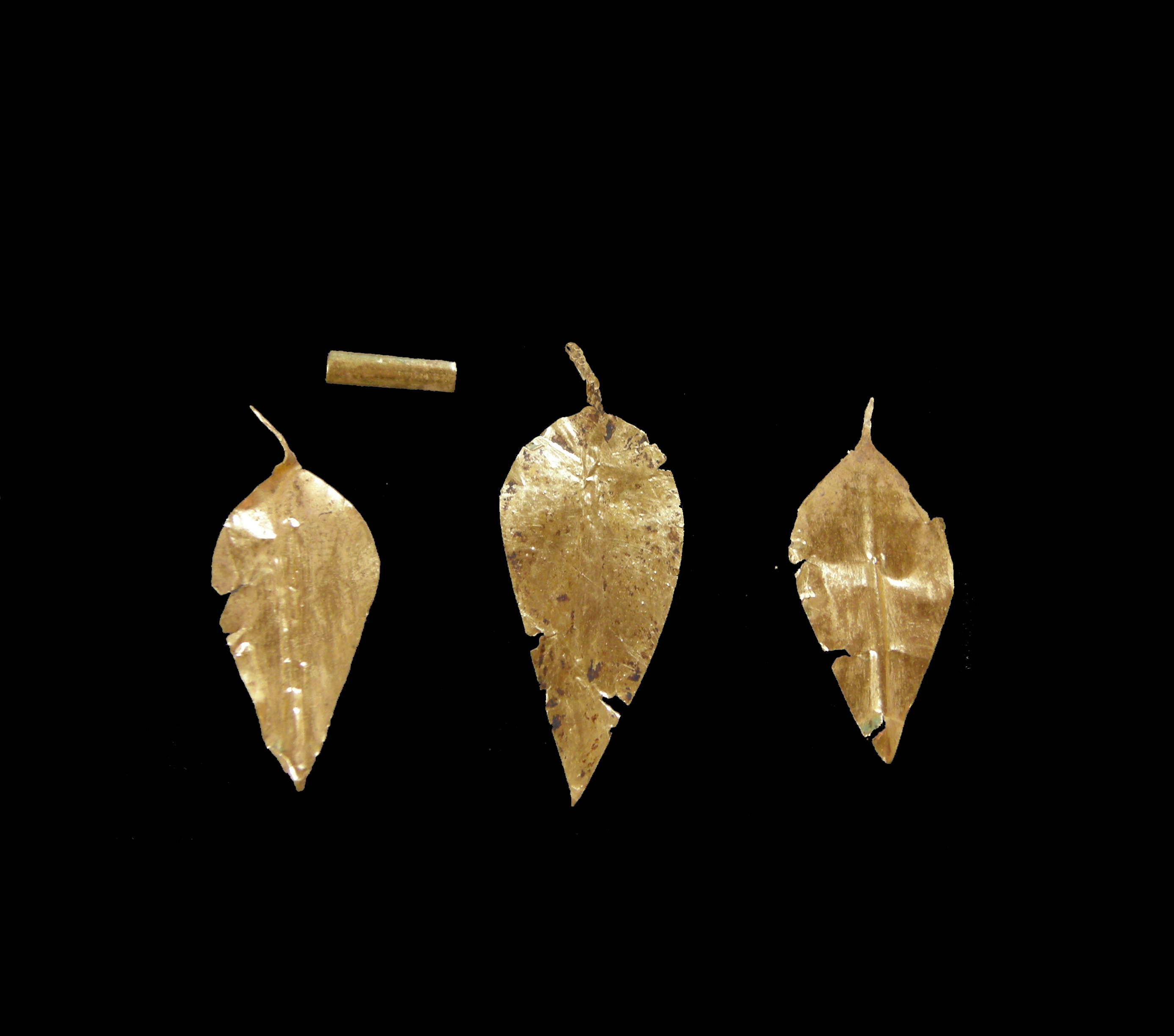 Τρία (3) χρυσά φύλλα μυρτιάς και ένα μικρό κυλινδρικό στέλεχος από λεπτό έλασμα.
