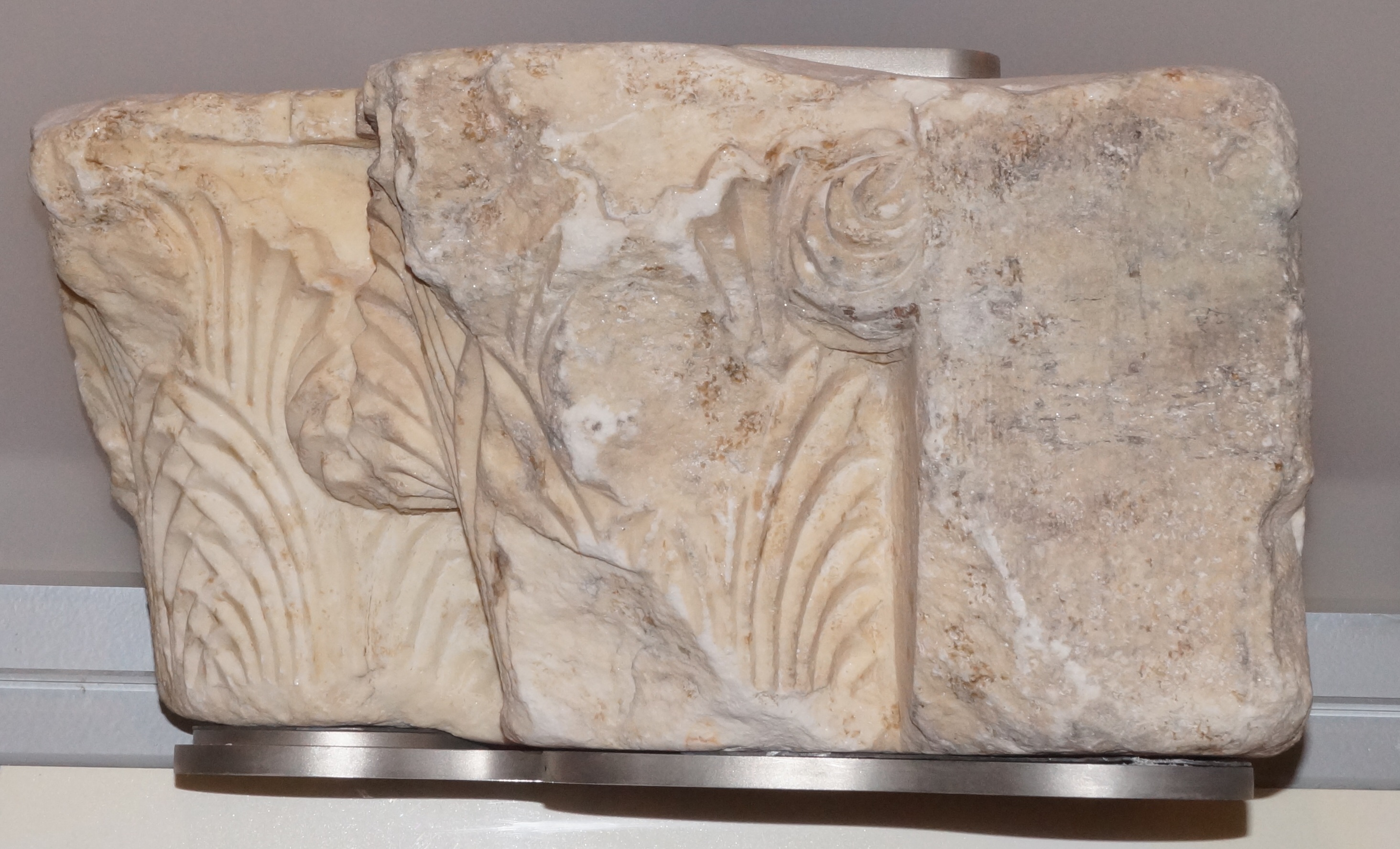 Επίστεψη σταθμού πυλώνα ( μεγάλης εξωτερική πόρτας) από μάρμαρο. Η κύρια όψη της επίστεψης φέρει ανάγλυφη φυτική διακόσμηση ενώ η πίσω πλευρά και η μία πλάγια είναι επίπεδες και αδιακόσμητες. Στη βάση εντοπίζονται τρείς οπές για τη συνένωση με άλλο τμήμα.