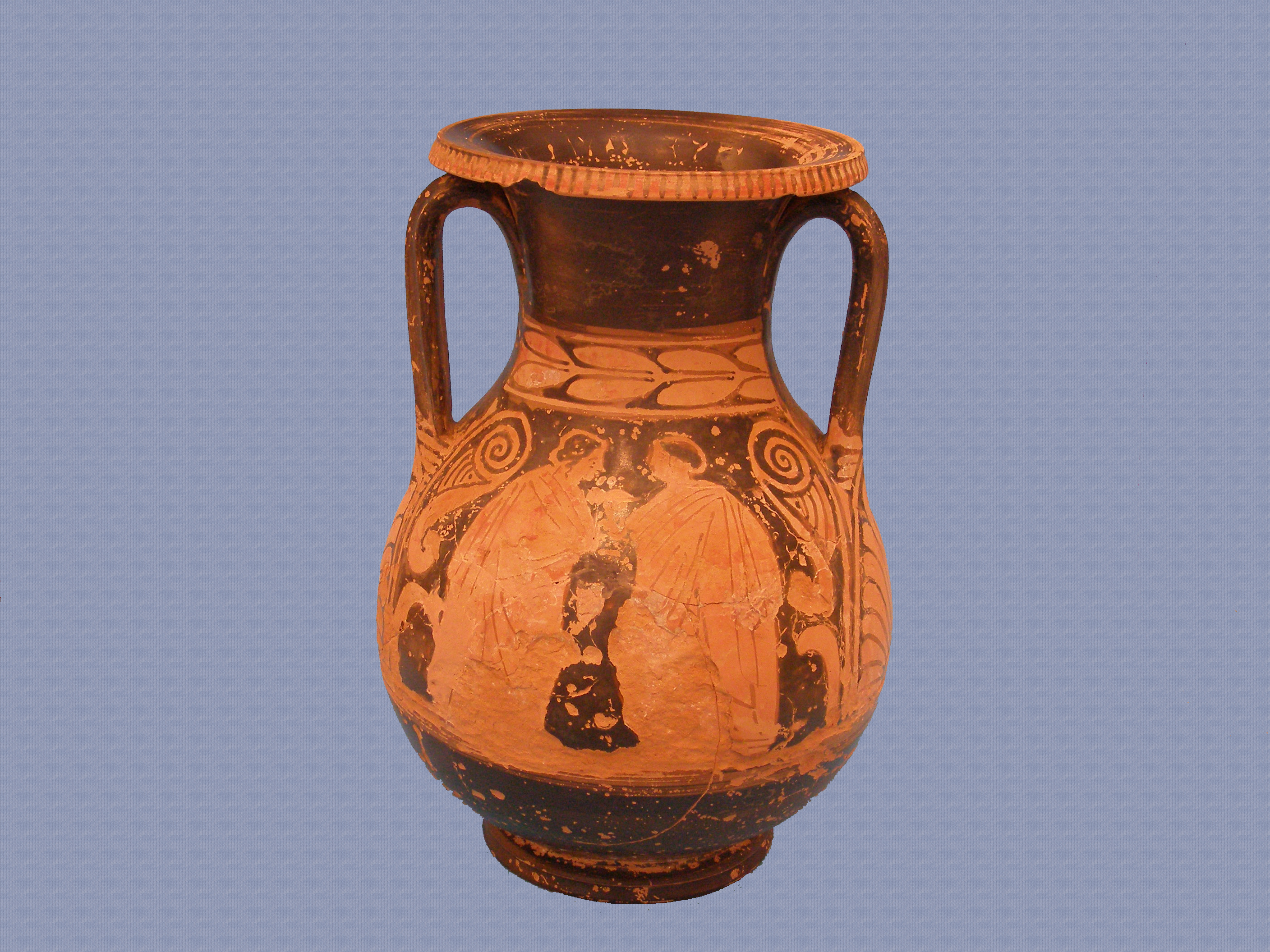 Ακέραια ερυθρόμορφη πελίκη, συγκολλημένη από έξι θραύσματα και αποκεκρουμένη στο χείλος και σε πολλά σημεία του σώματος. Φέρει βάση κοντή, κωνική σε δυο βαθμίδες ελαφρώς διαμορφωμένες, κοίλη στο κάτω μέρος με κυκλική εγχάρακτη αυλάκωση. Το σώμα είναι σφαιρικό πεπιεσμένο με αυλάκωση στο σημείο της μετάβασης από τη βάση. Ο λαιμός είναι ψηλός, αμφίκοιλος, ενώ το χείλος κυκλικό με πλατύ οριζόντιο περιχείλωμα που κάμπτεται προς τα κάτω. Οι λαβές είναι κάθετες ταινιωτές με κεντρική νεύρωση και προσφύονται στο λαιμό. Φέρει μελανό γάνωμα, απολεπισμένο κατά τόπους, εξαιρουμένης της ερυθρόμορφης παράστασης. Η ερυθρόμορφη παράσταση αναπτύσσεται στο σώμα του αγγείου. Στη μια όψη εικονίζονται δυο όρθιες ενδεδυμένες γυναικείες μορφές σε πλάγια όψη, αντωπά να συνομιλούν. Φορούν ιμάτιο, οι πτυχώσεις του οποίου αποδίδονται με γραπτές ερυθροκάστανες γραμμές. Η κόμη τους είναι μαζεμένη σε κόρυβο. Οι μορφές πατούν σε δυο παράλληλες γραπτές γραμμές. Άνω η παράσταση επιστέφεται από ζώνη γραπτών φύλλων δάφνης. Στην άλλη όψη εικονίζονται αντωπά δυο προτομές μορφών. Αριστερά διακρίνεται η προτομή γυναικείας μορφής με διάδημα και ενώτια, η κόμη της οποίας είναι μαζεμένη σε κόρυβο. Η αριστερή παλάμη τραβά το ένδυμα στον ώμο. Δεξιά υπάρχει προτομή ανδρικής μορφής με κοντή κόμη και πίλο. Η παράσταση πατά σε δυο παράλληλες γραπτές ταινίες και άνω επιστέφεται από ζώνη ιωνικών ωών. Η ζώνη κάτω της γένεσης των λαβών κοσμείται με γραπτά ανθέμια και υπερυψωμένες σπείρες ένθεν και ένθεν. Η κάθετη πλευρά του περιχειλώματος κοσμείται με σχηματοποιημένο γλωσσωτό κόσμημα. Η παράσταση φέρει ίχνη ερυθρού επίθετου χρώματος.