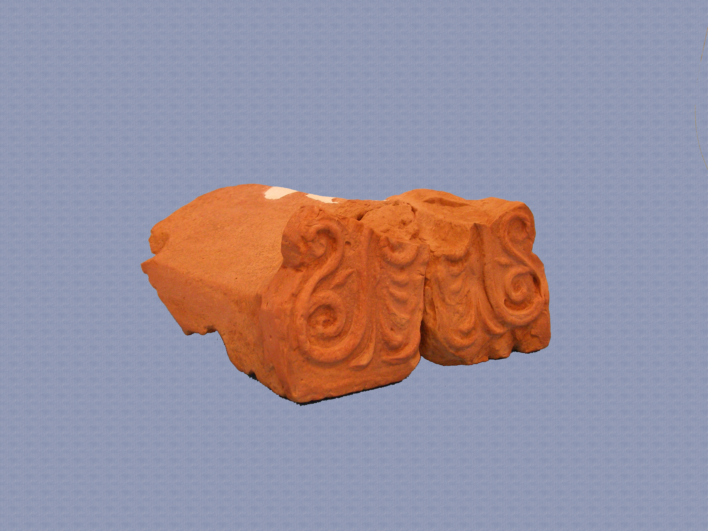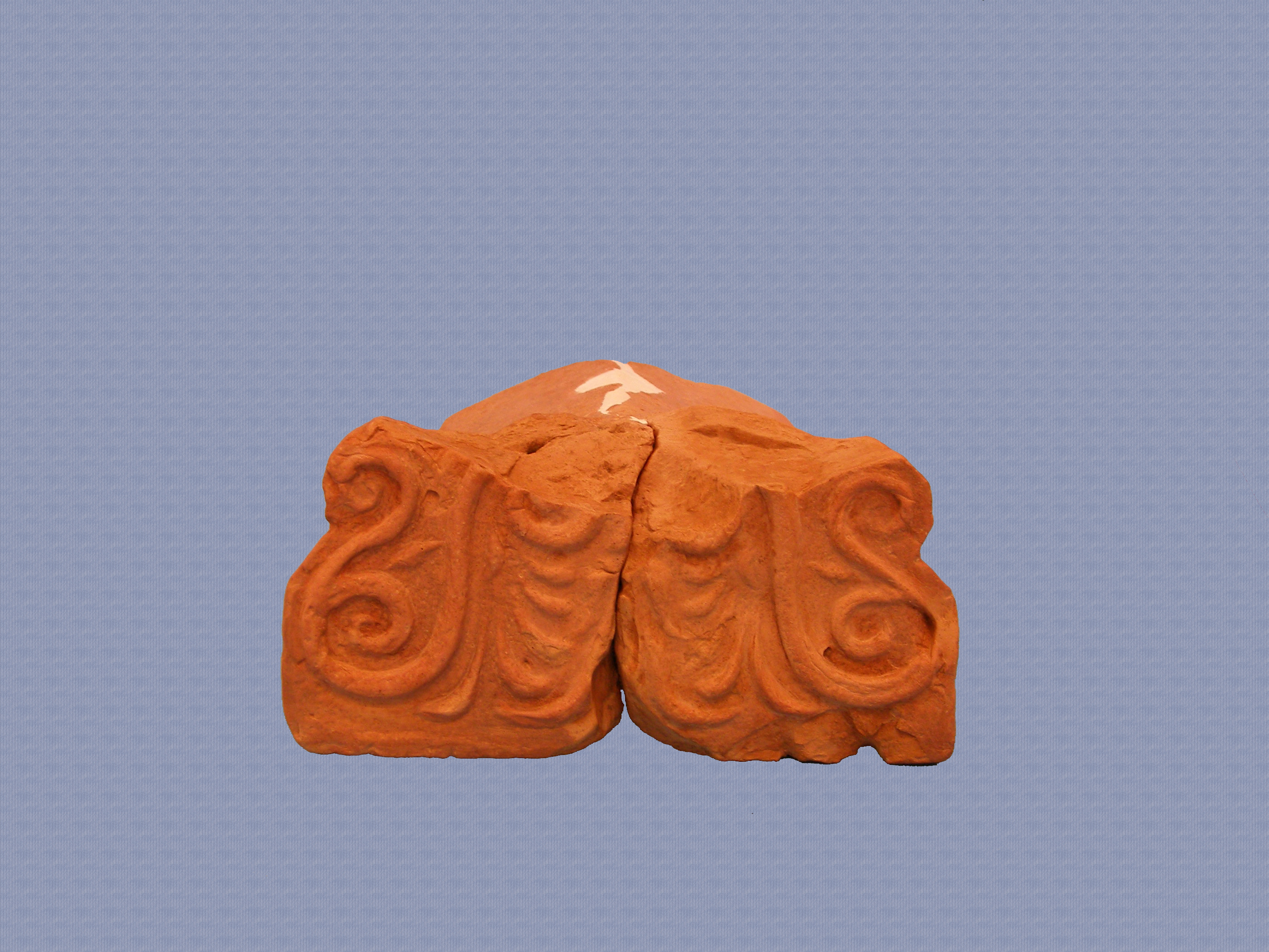 Τμήμα από ακροκέραμο με φυτική διακόσμηση στην μπροστινή επιφάνεια, μέτωπο. Σώζεται το κάτω τμήμα με διακόσμηση από ανθος λωτού, ημανθέμια, έλικες, σπείρες και φύλλα.