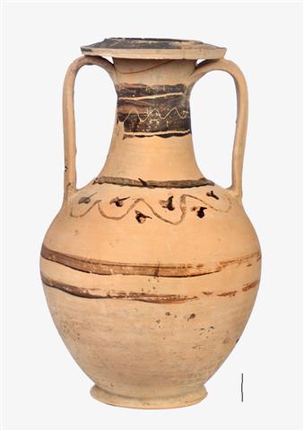 Τεφροδόχος αμφορέας, συγκολλημένος στο ανώτερο μέρος του λαιμού και στο χείλος από τέσσερα θραύσματα. Έχει μικρή συμπλήρωση στο χείλος, απολεπίσεις και ελαφρές αποκρούσεις στο σώμα και περιμετρικά της βάσης. Η βάση του είναι δακτυλιόσχημη και το σώμα του σφαιρικό. Ο λαιμός, λεπτός και κομψός, περνά στο σώμα, η επιφάνεια του οποίου εξαιρείται ανάγλυφα από του λαιμού, χωρίς σαφή διαμόρφωση του ώμου. Το χείλος είναι λοξό και ιδιαίτερα πλατύ (πλ. 0,028 μ.), με κάθετο περίγυρο, ύψους 0,01 μ. Οι λαβές είναι κάθετες, ταινιόσχημες, με ράχη που υπερυψώνεται, ώστε να εφάπτεται στο χείλος. Η ίδια περιτρέχεται, κατά μήκος, από έντονη ανάγλυφη ζώνη. Ο αμφορέας έχει γραπτή διακόσμηση με καστανομέλανη βαφή άνισης πυκνότητας: ολόβαφο είναι το εσωτερικό του αγγείου και το χείλος. Στο μέσο του ύψους του λαιμού υπάρχει φαρδιά, άτεχνη, ανισοπλατής καστανομέλανη ζώνη. Αυτή διακόπτεται από δύο πλατείς εγχάρακτους δακτυλίους, που πλαισιώνουν λεπτότερη εγχάρακτη κυματοειδή γραμμή. Στην επιφάνεια που ακολουθεί το πέρας της ζώνης διακρίνονται τυχαία, λόγω ρευστότητας, ίχνη βαφής. Τη μετάβαση λαιμού-σώματος περιτρέχει πλατύς, άτεχνος καστανομέλανος δακτύλιος και ακολουθεί η κυρίως διακοσμητική ζώνη: σχηματοποιημένα φυτικά μοτίβα, βλαστόσπειρες και κισσόφυλλα. Το πέρας της ζώνης αυτής σηματοδοτούν δύο αρκετά εξίτηλοι δακτύλιοι, που απέχουν μεταξύ τους περίπου 0,025 μ. Σποραδικά παρατηρούνται και άλλα τυχαία ίχνη καστανομέλανης βαφής, στη ράχη και τις παρυφές των λαβών και κάτω από την κυρίως διακοσμητική ζώνη (όπως κάθετη γραμμή, μήκους 0,052 μ.). Επικαθήσεις εντοπίζονται σε μεγάλη έκταση, σε ολόκληρο το αγγείο, ιδιαίτερα στο κατώτερο μέρος του σώματος και στην αθέατη επιφάνεια στήριξης της βάσης.