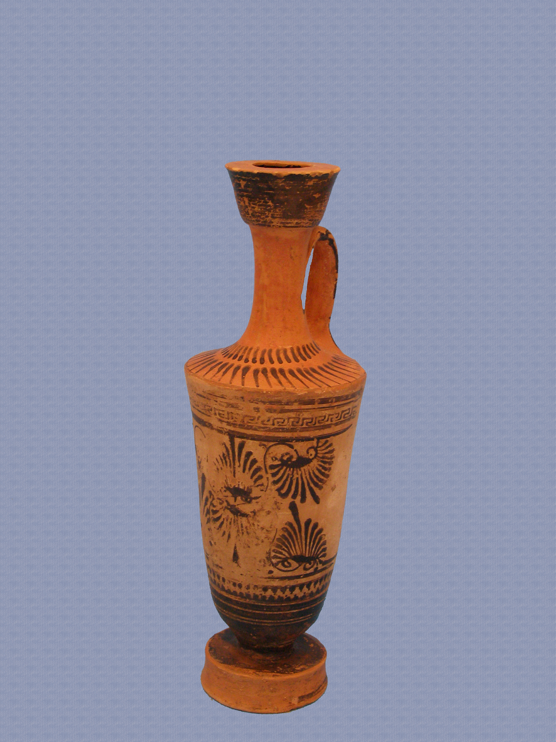 Η λήκυθος καλύπτεται από ερυθροκίτρινο επίχρισμα, πιο έντονο στο χείλος, στον λαιμό, στην εσωτερική επιφάνεια της λαβής, στον ώμο και στη βάση. Είναι διακοσμημένη με μελανή βαφή. Ολόβαφο είναι το εσωτερικό και το εξωτερικό του στομίου (άβαφη αφήνεται η οριζόντια επιφάνεια του χείλους), η ράχη της λαβής, το κατώτερο μέρος του σώματος και η πάνω επιφάνεια της βάσης. Τη βάση του λαιμού κοσμεί ένας δακτύλιος από λοξά διευθετημένες μικρού μήκους γραμμές, ενώ στην επιφάνεια του ώμου υπάρχει ακτινωτό κόσμημα. Στο κυρίως σώμα δύο ζεύγη μελανών δακτυλίων πλαισιώνουν μαίανδρο, κι ακολουθεί η κυρίως διακοσμητική ζώνη με ανθέμια: στο κέντρο βλέπουμε ένα όρθιο και ένα ανεστραμμένο ανθέμιο από όπου εκφύονται βλαστοί με άλλα δύο ζεύγη ανθεμίων που ακολουθούν αντιθετική φορά. Τη διακόσμηση ολοκληρώνει ένας μελανός δακτύλιος, στη συνέχεια μια ζώνη από δύο μελανούς δακτυλίους, στους οποίους εφάπτονται δισκάρια που φέρουν από μία στιγμή στην περιφέρειά τους. Ακολουθούν τέσσερις μελανοί δακτύλιοι, εκ των οποίων ο ένας είναι αρκετά πλατύτερος από τους άλλους, και το ολόβαφο τμήμα στο κατώτερο μέρος του αγγείου. Ένας ακόμα μελανός δακτύλιος κοσμεί την κατακόρυφη επιφάνεια της κυλινδρικής βάσης. Η παράσταση είναι σε μεγάλο βαθμό απολεπισμένη και δεν συνεχίζεται στο πίσω μέρος της ληκύθου. Η μελανή βαφή στο υπόλοιπο αγγείο είναι κατά τόπους απολεπισμένη και εξίτηλη. Στο πίσω τμήμα της ληκύθου υπάρχουν σε μεγάλη έκταση επικαθήσεις.