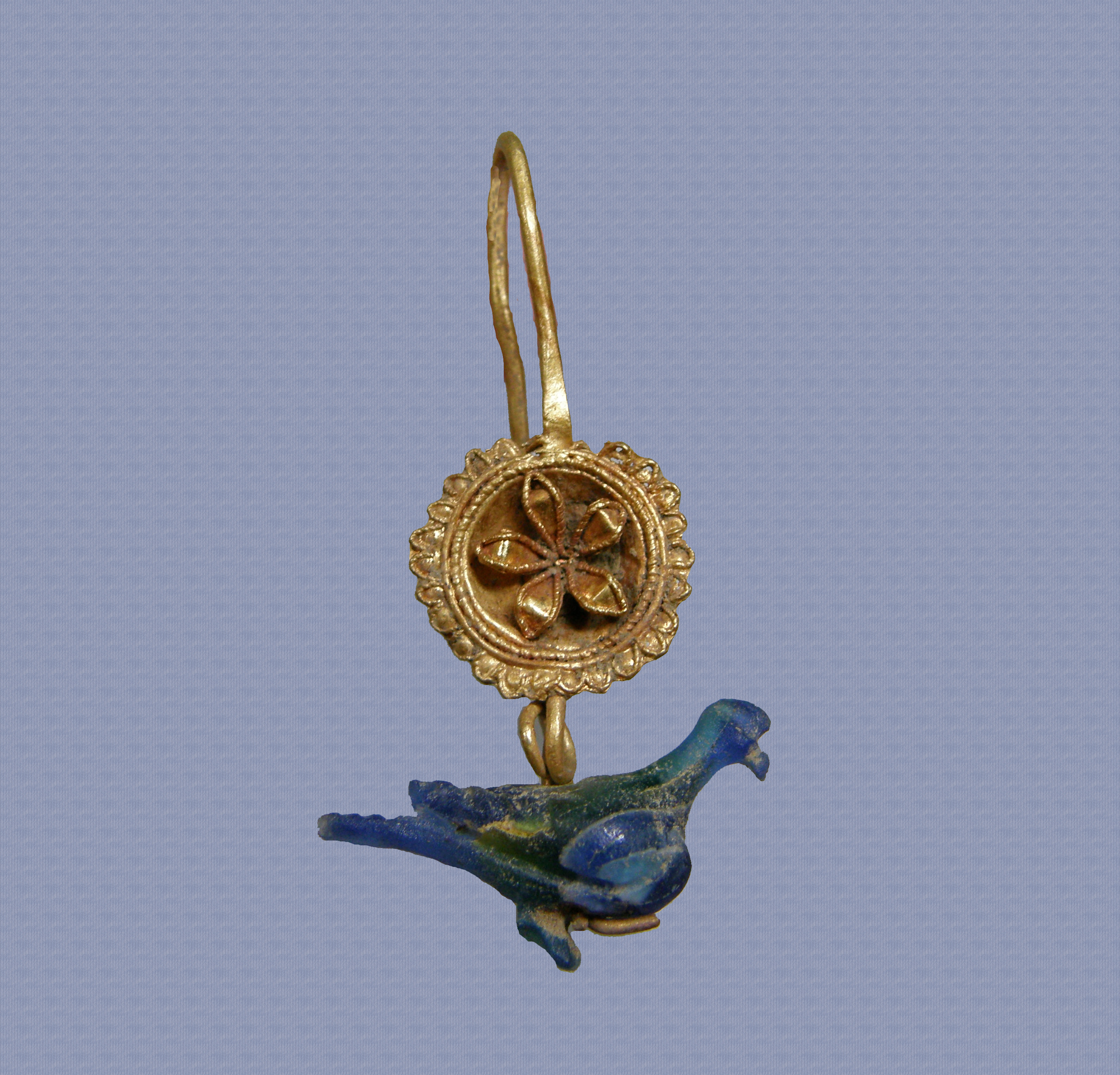 Χρυσό ενώτιο (σκουλαρἰκι). Αποτελείται από ένα ρόδακα πεντάφυλλο με περιφέρεια από λεπτό σύρμα και κοκκιδωτό περίγραμμα. Ο ρόδακας είναι κατασκευασμένος με τη συρματερή τεχνική και διακοσμημένος με μικρούς διαφανείς λίθους (διατηρείται ένας). Επανω φέρει στέλεχος ανάρτησης αγκύλο και από έναν διπλό δακτύλιο στο κάτω τμήμα του ρόδακα κρέμεται μικρό πτηνό, μάλλον περιστέρι, από γαλαζοπράσινη υαλόμαζα.