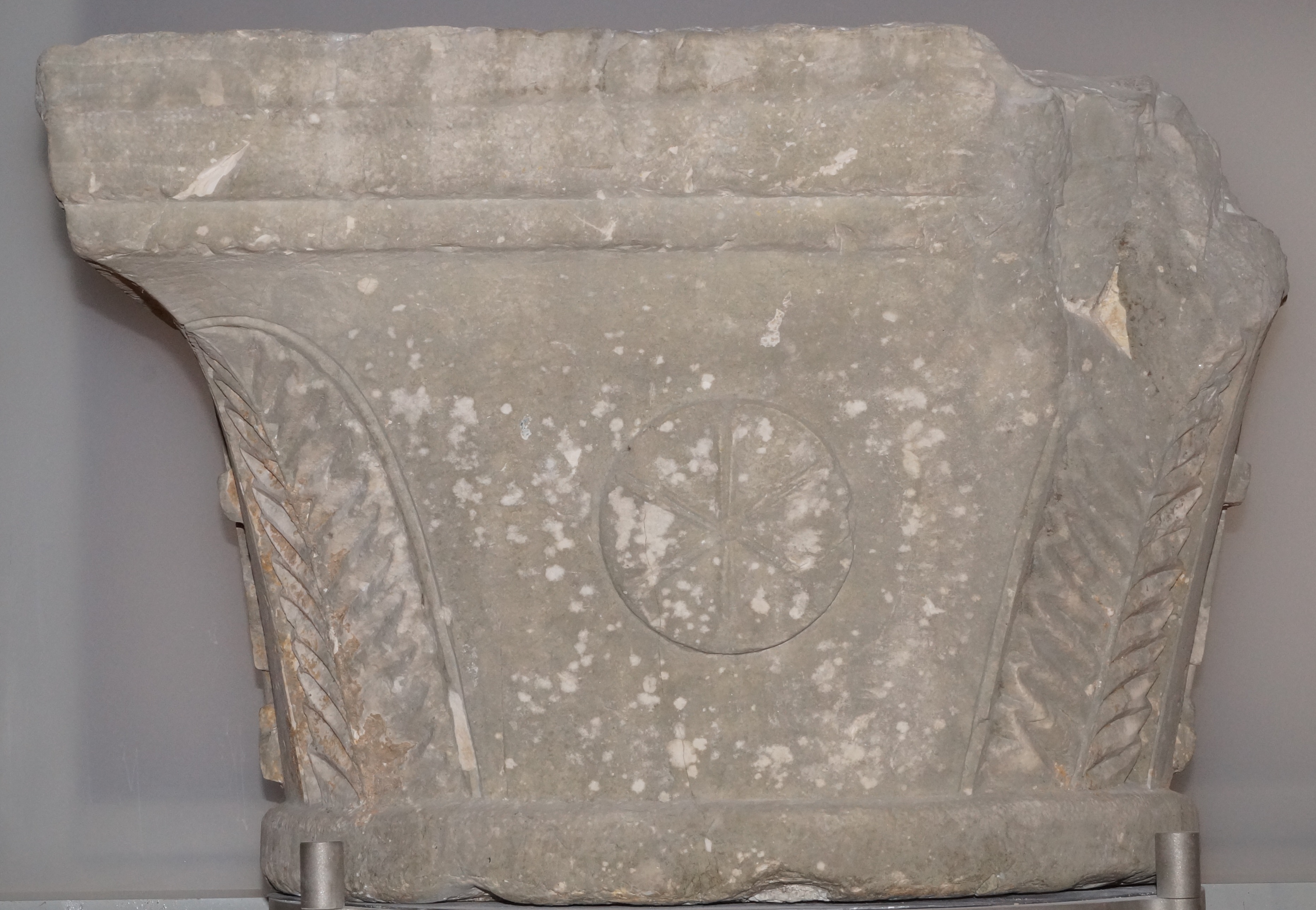 Μαρμάρινο τεκτονικό κιονόκρανο. Θραυσμένο σε ορισμένα σημεία. Είναι διακοσμημένο με ανάγλυφα φοινικοειδή φύλλα στις γωνίες και με κυκλικό κόσμημα με ακτίνες στο κέντρο κάθε πλευράς.