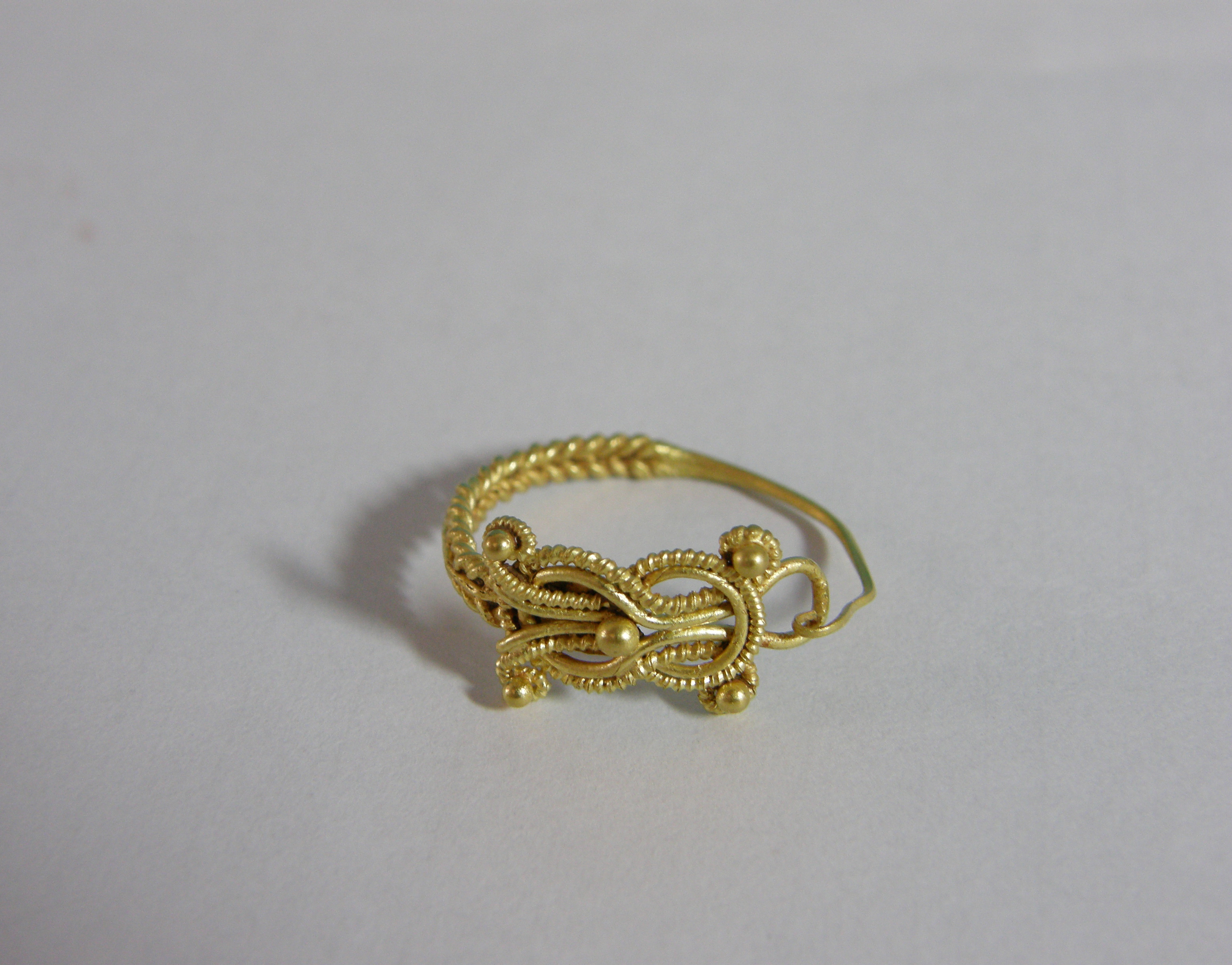 Χρυσό ενώτιο. Σχηματίζει δακτύλιο από λεπτό έλασμα γωνιώδους διατομής. Ο μισός πλαισιώνεται από δύο στριφτά σύρματα και απολήγει στο ένα άκρο σε άγκιστρο και στο άλλο σε πεπλατυσμένο έλασμα όπου επικολλάται ''ηράκλειο άμμα'' από διπλό σύρμα, ένα απλό και ένα στριφτό, οι άκρες του στριφτού σύρματος ελίσσονται σε μικρούς δακτυλίους στις 4 γωνίες του κόμβου και κοσμούνται από σφαιρίδιο όπως και το κέντρο του, ενώ το απλό σύρμα σχηματίζει θηλειά όπου στερεώνεται το άγκιστρο. Βρέθηκε μαζί με χάλκινα ελάσματα (Χ39) στον τεφροδόχο αμφορέα Π100.