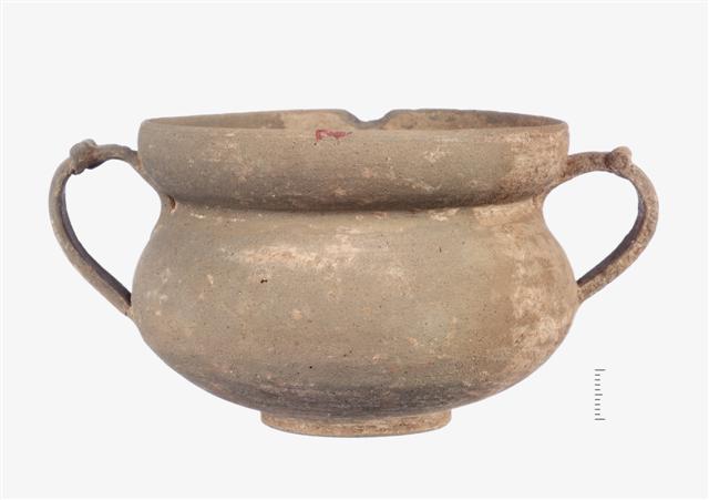 Κύπελλο ακέραιο. Μικρή απόκρουση στο χείλος. Φέρει βάση δακτυλιόσχημη, σώμα ημισφαιρικό διμερές με τοιχώματα λεπτά. Το ανώτερο τμήμα εξωτερικά είναι κυρτό. Οι λαβές είναι κάθετες ταινιωτές με τρείς κάθετες αυλακώσεις και πλαστική απόφυση κοντά στην άνω πρόσφυση.