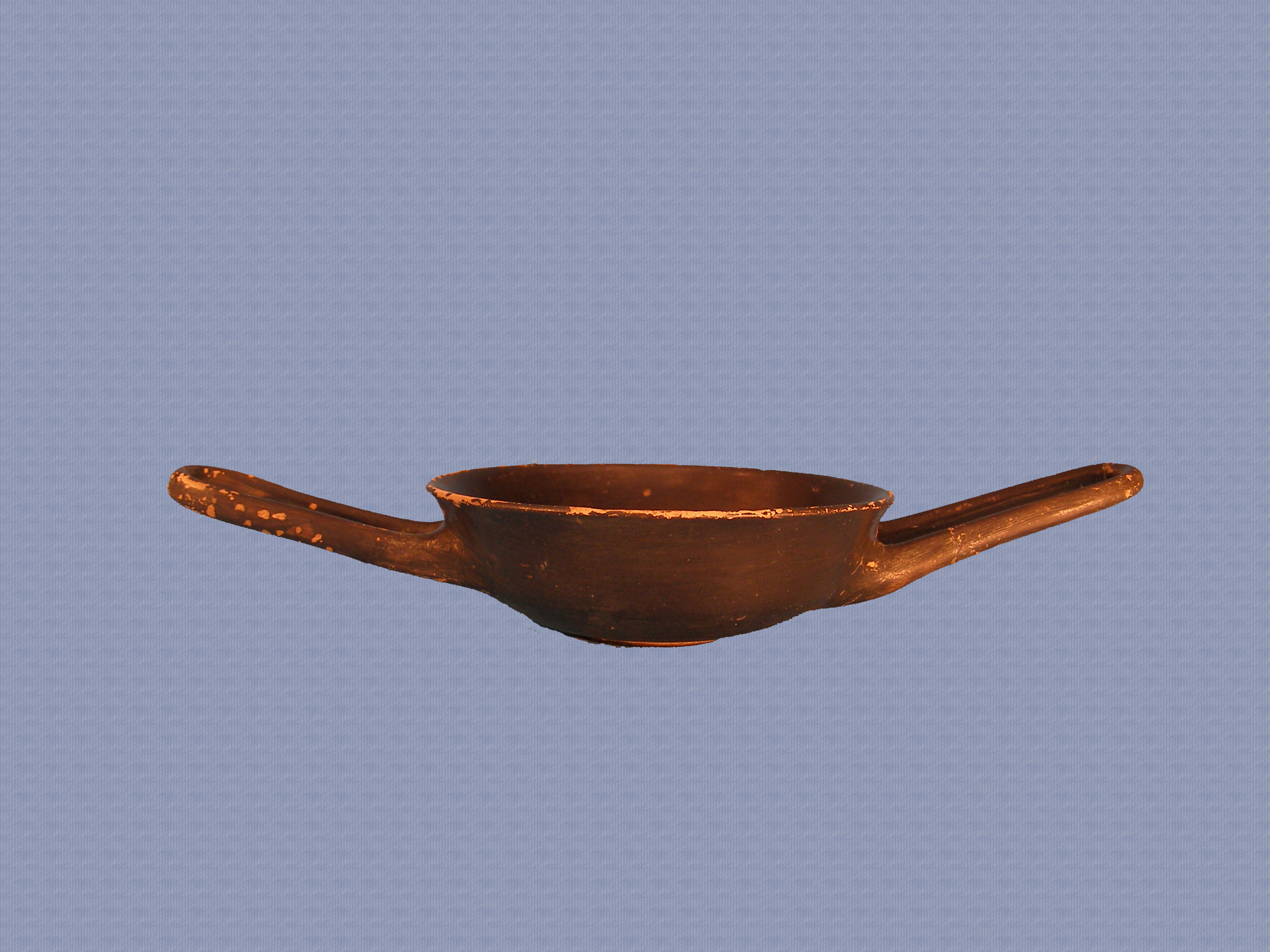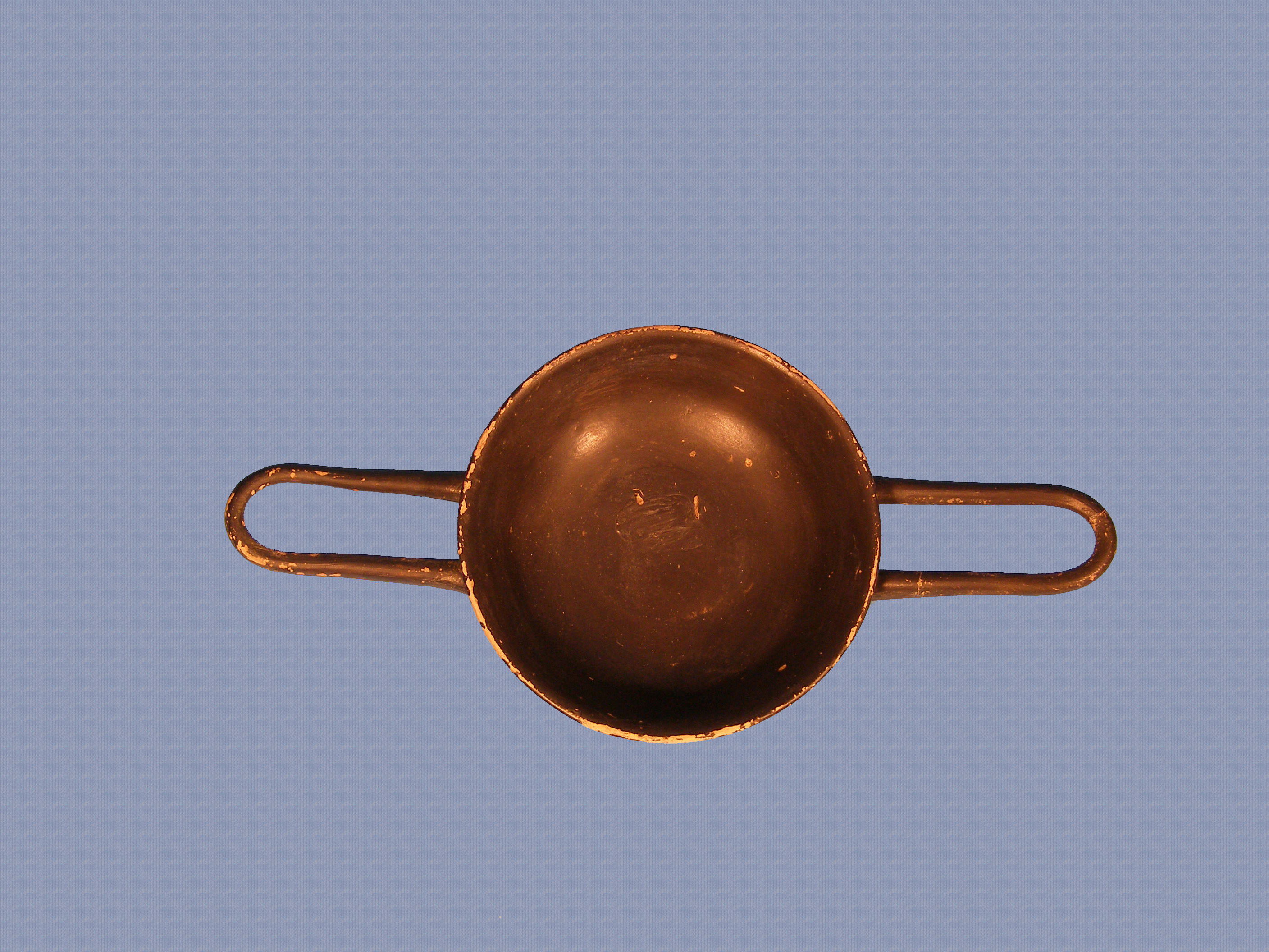Μελαμβαφής άποδη κύλικα. Συγκολλημένη σε τμήμα της λαβής. Φέρει αποκρούσεις και κατά τόπους απολεπίσειςτου γανώματος. Πλαστικός δακτύλιος στη βάση η αθέατη επιφάνεια της οποίας φέρει διακόσμηση από μελανή στιγμή και ομόκεντρο δακτύλιο καστανομέλανου επιχρίσματος. Ζώνη λεπτή που αφήνεται στο χρώμα του πηλού στην αρχή του σώματος. Το σώμα είναι καμπύλο με ομαλή μετάβαση στο ελαφρώς έξω νεύον χείλος. Λαβές ιδιαίτερα επιμήκεις, κυλινδρικής διατομής, υπερβαίνουν ελαφρώς το ύψος του χείλους.