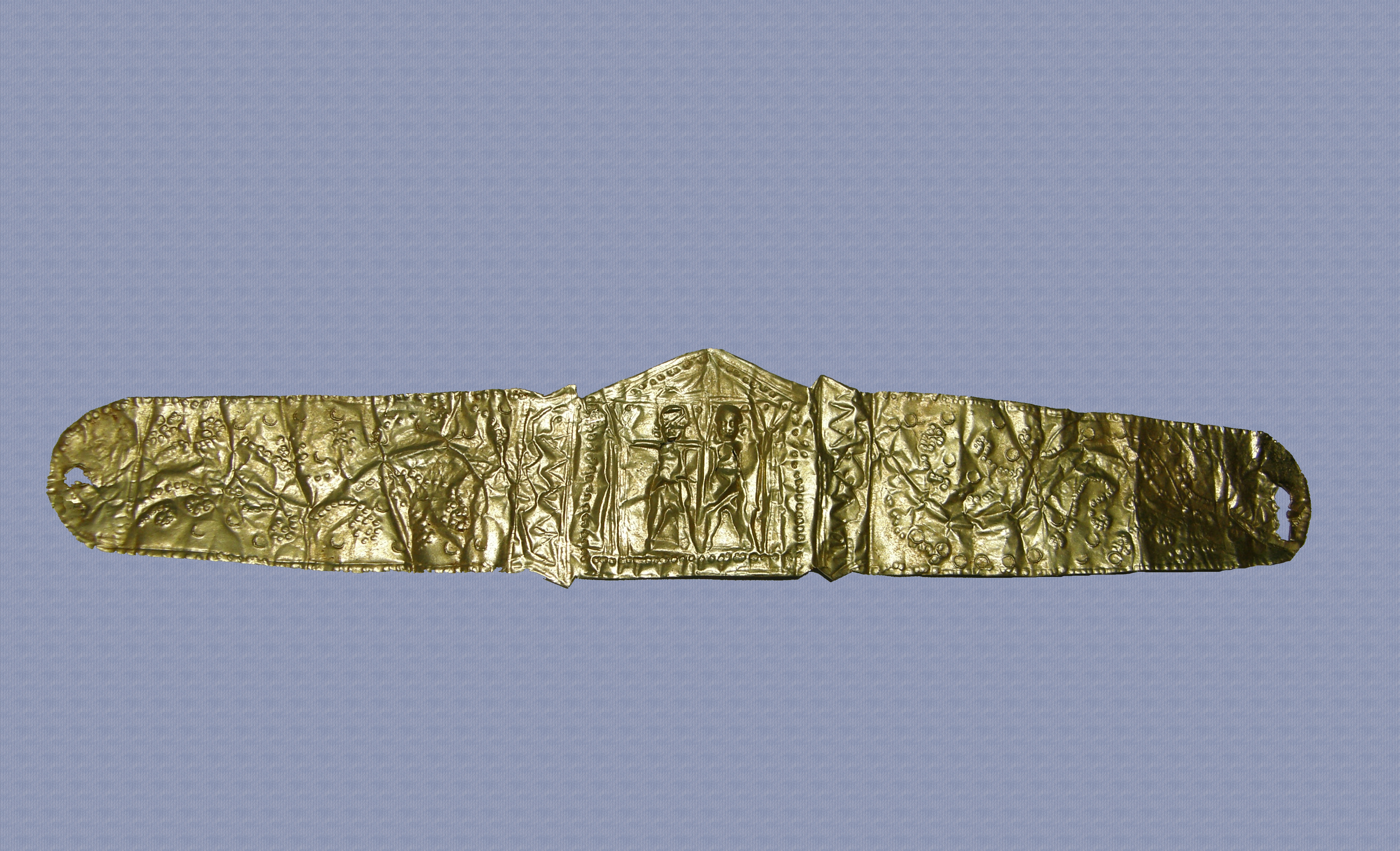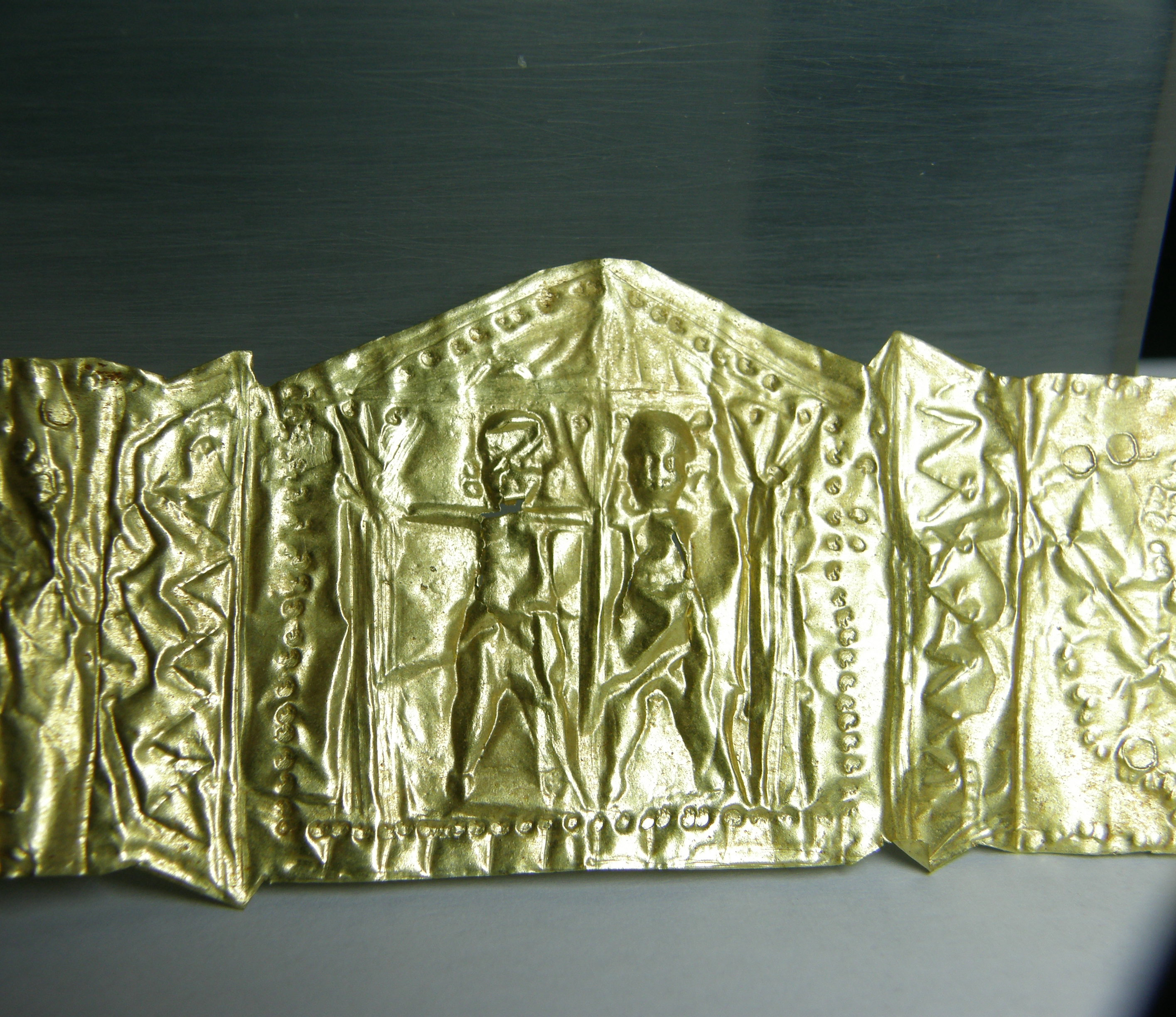Χρυσή ταινία (έλασμα), μάλλον διάδημα (κόσμημα κεφαλής). Οι παρυφές και τα διάτρητα στρογγυλεμένα άκρα της έχουν κοκκιδωτή διακόσμηση. Στο μέσον διακοσμείται με τετράγωνο πλαίσιο με αέτωμα, με κοκκιδωτό περίγραμμα. Πρόκειται ίσως για ομοίωμα κτιρίου. Στο εσωτερικό του εικονίζονται δύο όρθιες μετωπικές μορφές, με αδρά χαρακτηριστικά. Δεξιά και αριστερά, καθώς και ανάμεσα τους, εικονίζονται σχηματοποιημένα δέντρα. Εκατέρωθεν του τετράγωνου πλαισίου υπάρχει από μία στήλη, με άκρα που προεξέχουν, κοσμημένη με κάθετη τεθλασμένη γραμμή. Η υπόλοιπη ταινία καλύπτεται με κυματοειδείς γραμμές (κλαδιά μάλλον), από τις οποίες φυτρώνουν έλικες και σχηματοποιημένα άνθη ή καρποί. Ως παραπληρωματικά κοσμήματα χρησιμοποιούνται φολίδες. Η όλη διακόσμηση είναι έκτυπη, φτιαγμένη με τη σφυρήλατη τεχνική. Οι δύο μορφές παρουσιάζουν μικρές φθορές. Μικρές φθορές υπάρχουν και στη μία (δεξιά) οπή πρόσδεσης.