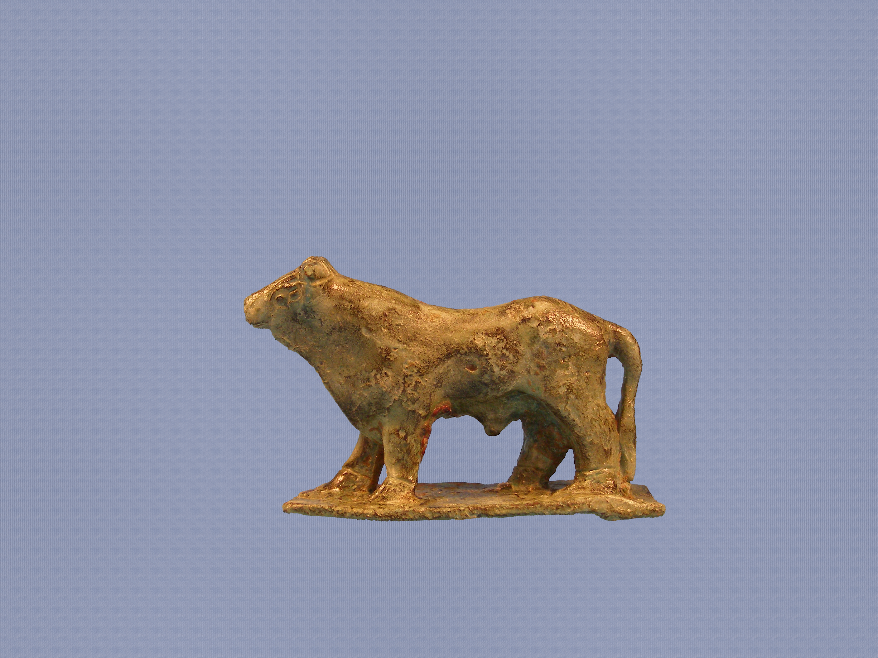 Ακέραιο χάλκινο ζωόμορφο (βοειδές) ειδώλιο σε βηματισμό. Φέρεται πάνω σε ορθογώνια βάση. Αρκετά φυσικοκρατική απόδοση του σώματος και των λεπτομερειών της κεφαλής. Εγχάρακτα αποδοσμένοι οφθαλμοί, τριγωνικό σχεδόν ρύγχος και δύο τριγωνικές αποφύσεις για την απόδοση των κεράτων.