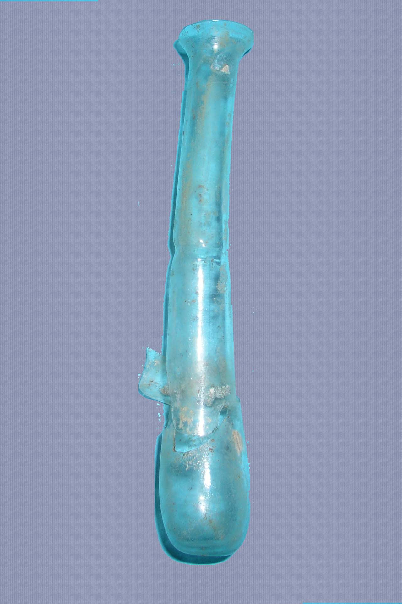 Υάλινο μυροδοχείο. Ελλιπές σε τμήμα του σώματος,συγκολλημένο από δύο τμήματα. Η επιφάνεια στήριξης είναι επίπεδη. Σώμα δακρυόσχημο, μεταβαίνει ομαλά με αβαθή αυλάκωση σε ψηλό, στενό, κυλινδρικό λαιμό, χείλος έξω νεύον χοανόσχημο.