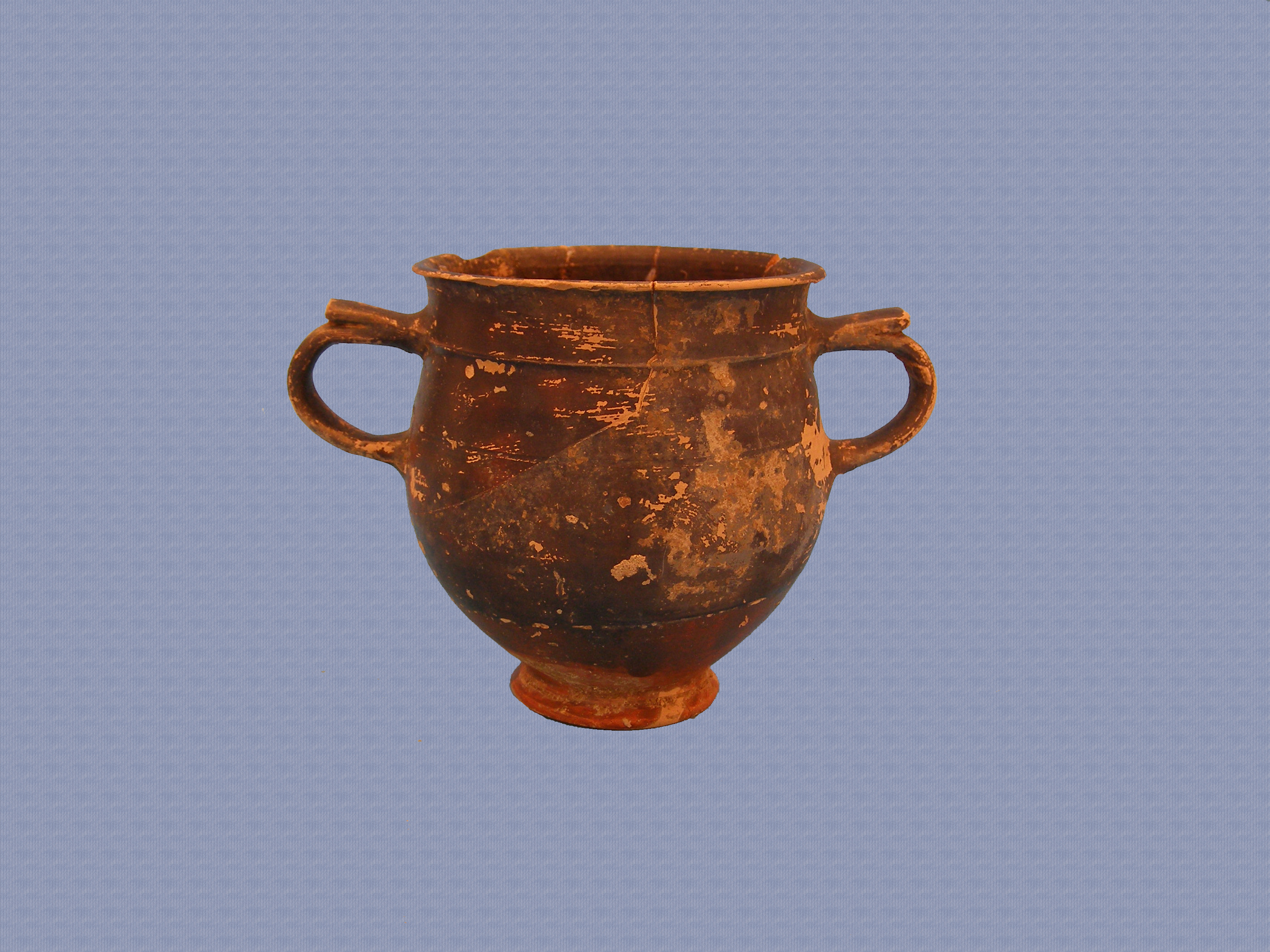 Ακέραιος μελαμβαφής κάνθαρος, συγκολλημένος από έξι κομμάτια. Φέρει βάση χαμηλή δακτυλιόσχημη με κωνικό έξαρμα στο εσωτερικό της και σώμα βαθύ κυρτό στο κατώτερο τμήμα και ελαφρά κοίλο στο ανώτερο. Λεπτή νεύρωση τονίζει τη μετάβαση από το σώμα στο ελαφρά έξω νεύον χείλος και ορίζει το σημείο από το οποίο εκφύονται οι δύο κάθετες ταινιωτές λαβές, που επιστέφονται με δύο οριζόντιους λοβούς. Το μελανό γάνωμα καλύπτει εσωτερικά και εξωτερικά το αγγείο, εκτός από το κατώτερο μέρος του σώματος που φέρει ερυθροκάστανο βερνίκι. Στην επιφάνεια εντοπίζονται μικρές αποκρούσεις και απολεπίσματα.