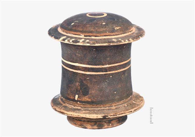 Ακέραιη πήλινη μελαμβαφής πυξίδα με πώμα. α) Βάση δακτυλιόσχημη με κωνικό έξαρμα στην υπόκοιλη επιφάνεια έδρασης. Μετάβαση από τη βάση στη στεφάνη με αναβαθμό. Μετά τη στεφάνη απολήγει σε κωνικό σώμα. Ιδιαίτερα εξίτηλο καστανομέλανο γάνωμα. β) Πώμα με κυλινδρικό σώμα, μετάβαση στη στεφάνη με αβαθή αυλάκωση, ομοίως και από τη στεφάνη στη θόλο. Διατηρούνται ίχνη γραπτής διακόσμησης με ακτινωτές γραμμές. Στη θόλο διακόσμηση εγχάρακτων ομόκεντρων δακτυλίων.