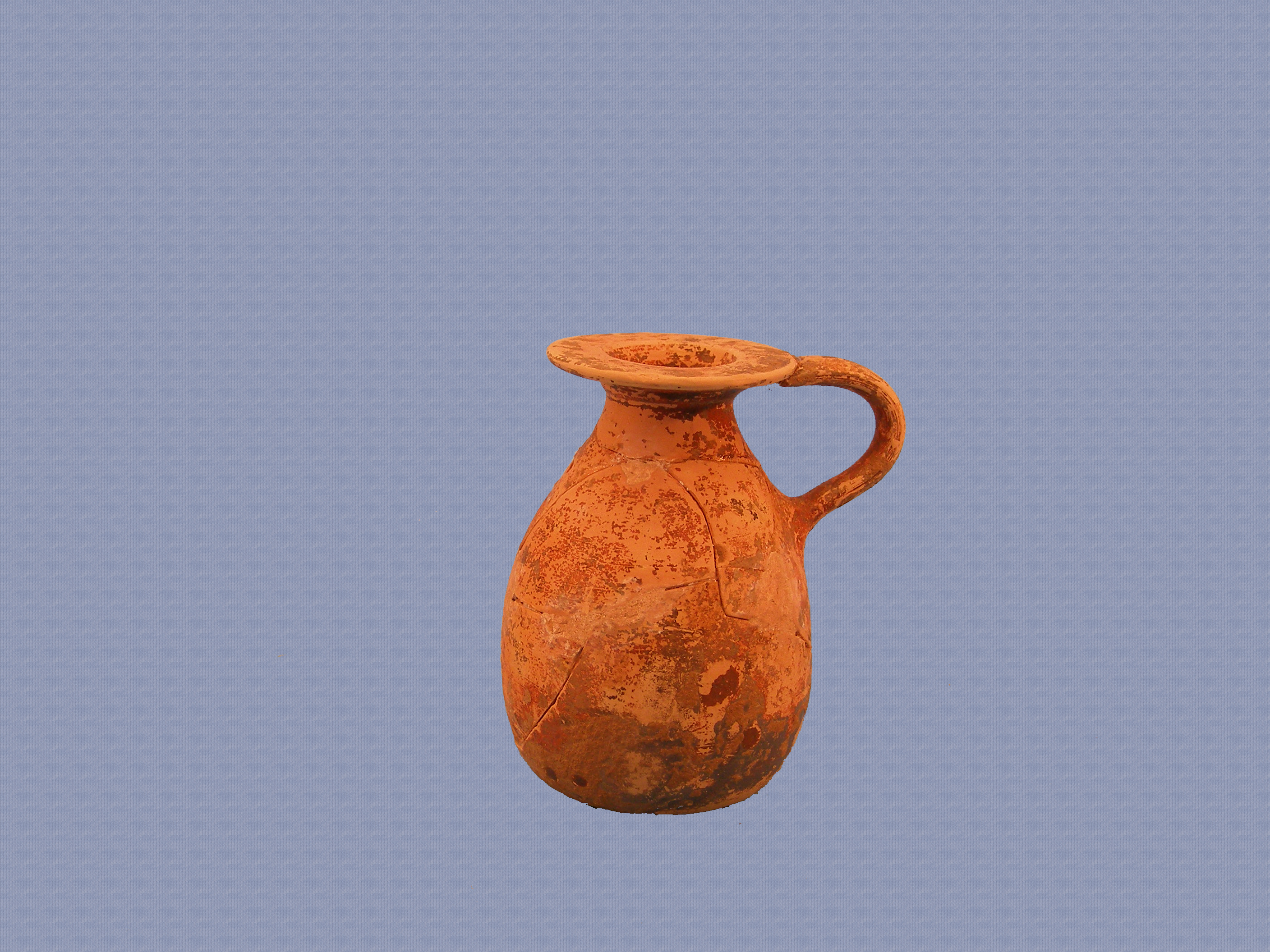 Ερυθροβαφής όλπη. Σώζεται ακέραιη και είναι συγκολλημένη από πολλά κομμάτια και συμπληρωμένη κατά τόπους. Το ερυθρό γάνωμα έχει σε μεγάλο βαθμό απολεπιστεί. Η βάση δηλώνεται ως αβαθής κοίλανση. Το σώμα είναι κωνικό, που στενεύει προς το βραχύ λαιμό και απολήγει σε πλατύ οριζόντιο χείλος. Η λαβή είναι κάθετη κυλινδρική, εκφύεται από τον ώμο και προσφύεται κάτω από το χείλος.